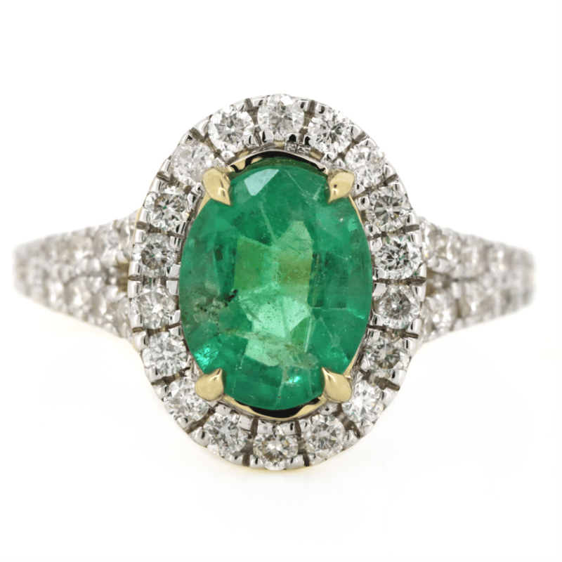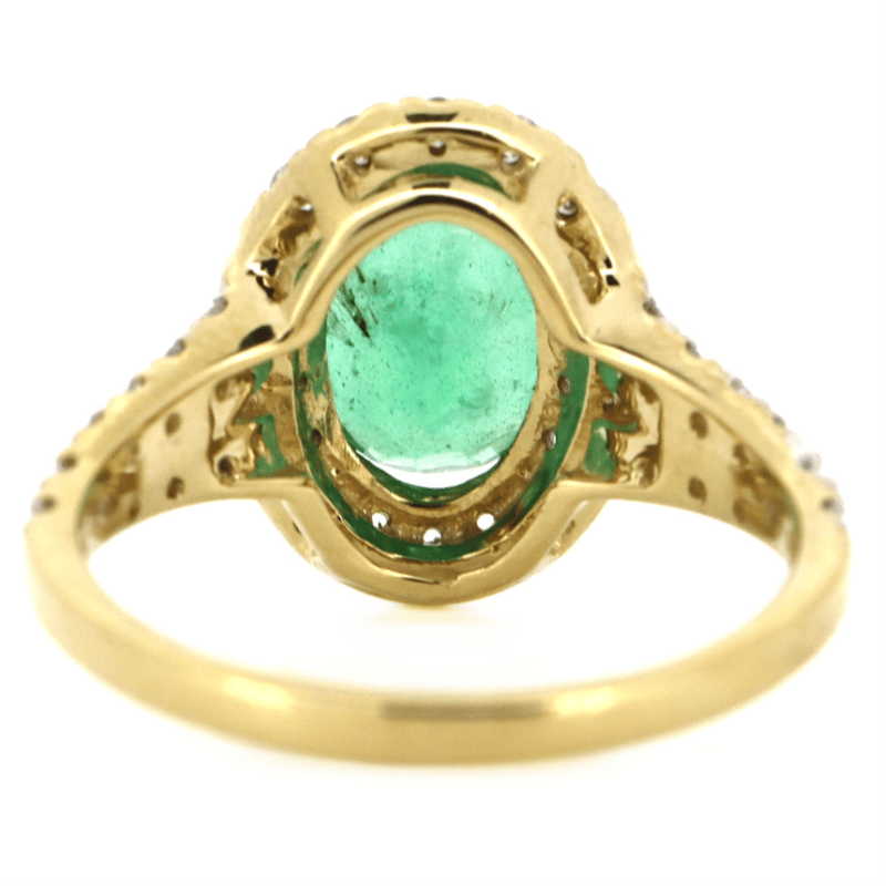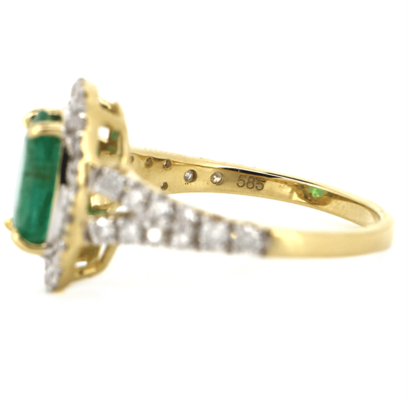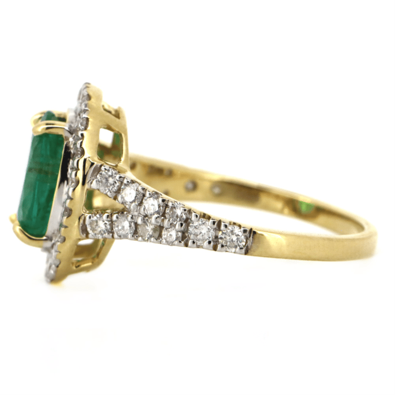 14K YELLOW GOLD, 1.57CT ZAMBIAN EMERALD AND DIAMOND, HALO RING. The Centre Features, One Oval Faceted Cut, Light Fancy Yellow, Diamond (0.46Ct, Si1-Si2 Clarity), 4 Claw Set. Flanking The Centre Are, 2 Pear Brilliant Cut, Light Fancy Yellow, Diamonds (0.40Ct Tdw, Si1-Si2 Clarity), 3 Claw Set In Yellow Gold. Decorating The Band Are, 12 Round Brilliant Cut, Diamonds (0.10Ct Tdw, G-H Colour, Si1-Si2 Clarity), Bead Set In White Gold. Ring Size N 1/2. Valuations Provided by an Independent Third-Party Professional Not Directly Associated With Lloyds Auctions at AUD $$18,000.00This valuation has been conducted by an independent third-party professional. The valuation amount is an assessment by the issuing valuer and does not reflect the auction value of the item. Any inquiries regarding the valuation should be directed to the issuing valuer (refer to contact details on the certificate), as Lloyds Auctions has no affiliation or influence over the valuation, the valuer, or the stated amount. Condition: Good - Refer Images 0+89