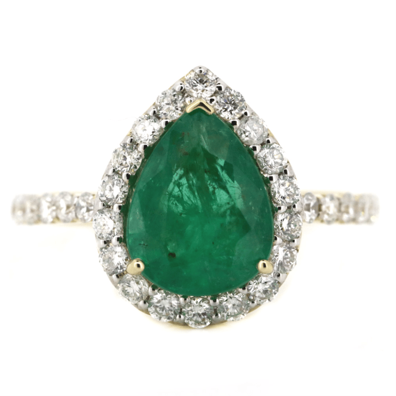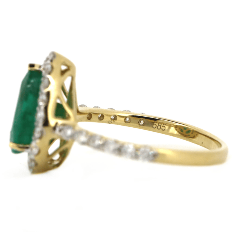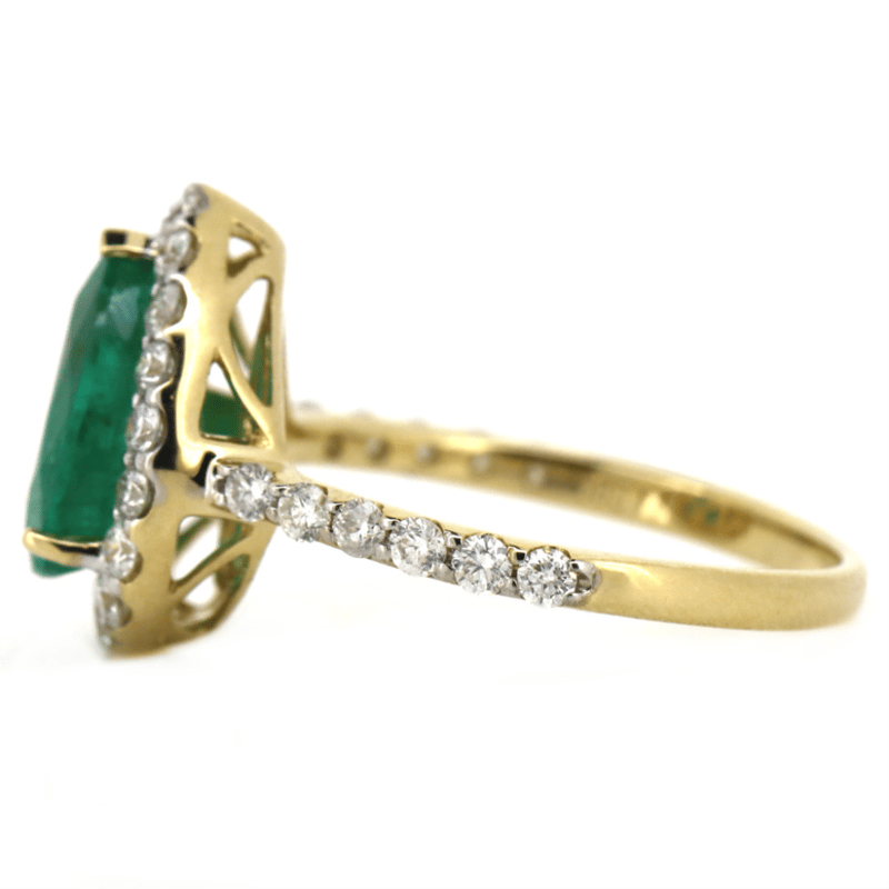 14K YELLOW GOLD, 1.80CT ZAMBIAN EMERALD AND DIAMOND, HALO RING. The Centre Features, One Oval Faceted Cut, Light Fancy Yellow, Diamond (0.46Ct, Si1-Si2 Clarity), 4 Claw Set. Flanking The Centre Are, 2 Pear Brilliant Cut, Light Fancy Yellow, Diamonds (0.40Ct Tdw, Si1-Si2 Clarity), 3 Claw Set In Yellow Gold. Decorating The Band Are, 12 Round Brilliant Cut, Diamonds (0.10Ct Tdw, G-H Colour, Si1-Si2 Clarity), Bead Set In White Gold. Ring Size N 1/2. Valuations Provided by an Independent Third-Party Professional Not Directly Associated With Lloyds Auctions at AUD $$17,000.00This valuation has been conducted by an independent third-party professional. The valuation amount is an assessment by the issuing valuer and does not reflect the auction value of the item. Any inquiries regarding the valuation should be directed to the issuing valuer (refer to contact details on the certificate), as Lloyds Auctions has no affiliation or influence over the valuation, the valuer, or the stated amount. Condition: Good - Refer Images 0+73