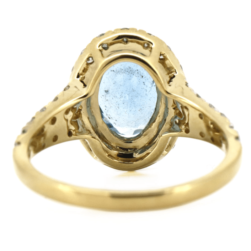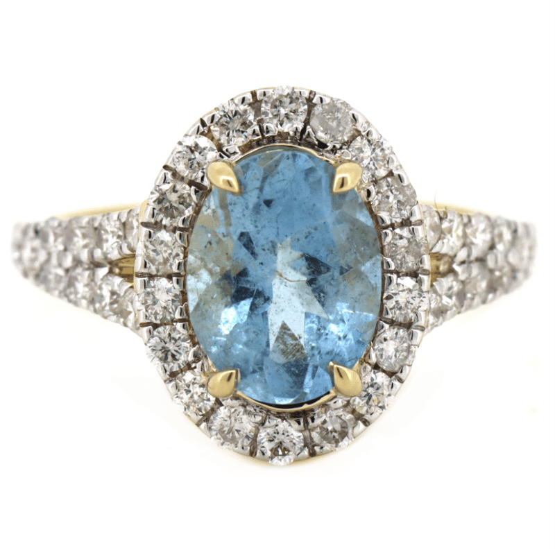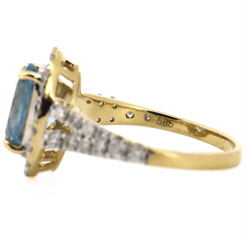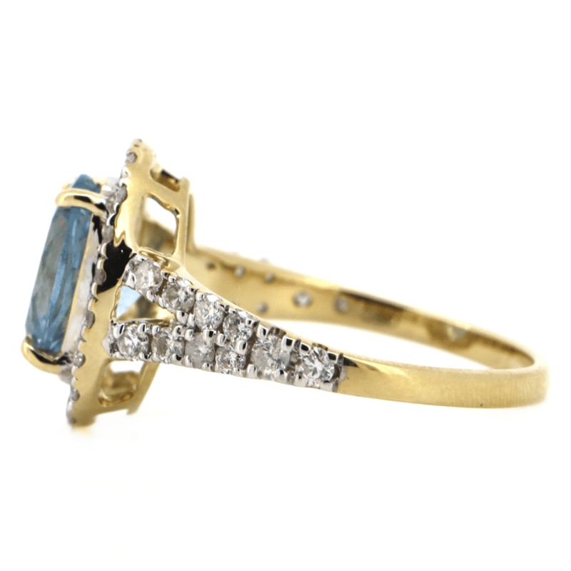 14K YELLOW GOLD, AQUAMARINE AND DIAMOND, HALO RING.