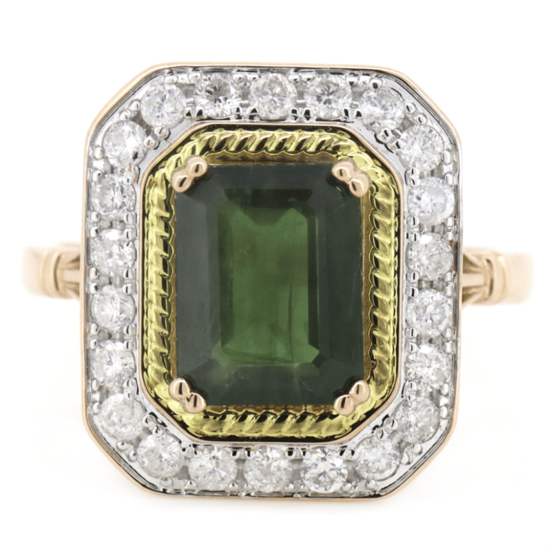14K ROSE/YELLOW GOLD, GREEN SAPPHIRE AND DIAMOND, HALO RING. The Centre Features, One Oval Faceted Cut, Light Fancy Yellow, Diamond (0.46Ct, Si1-Si2 Clarity), 4 Claw Set. Flanking The Centre Are, 2 Pear Brilliant Cut, Light Fancy Yellow, Diamonds (0.40Ct Tdw, Si1-Si2 Clarity), 3 Claw Set In Yellow Gold. Decorating The Band Are, 12 Round Brilliant Cut, Diamonds (0.10Ct Tdw, G-H Colour, Si1-Si2 Clarity), Bead Set In White Gold. Ring Size N 1/2. Valuations Provided by an Independent Third-Party Professional Not Directly Associated With Lloyds Auctions at AUD $$12,390.00This valuation has been conducted by an independent third-party professional. The valuation amount is an assessment by the issuing valuer and does not reflect the auction value of the item. Any inquiries regarding the valuation should be directed to the issuing valuer (refer to contact details on the certificate), as Lloyds Auctions has no affiliation or influence over the valuation, the valuer, or the stated amount. Condition: Good - Refer Images 0+68