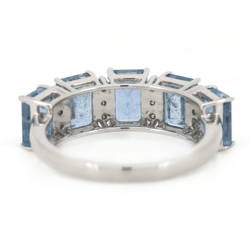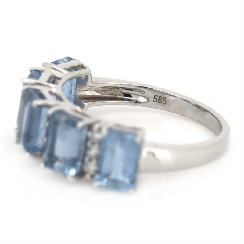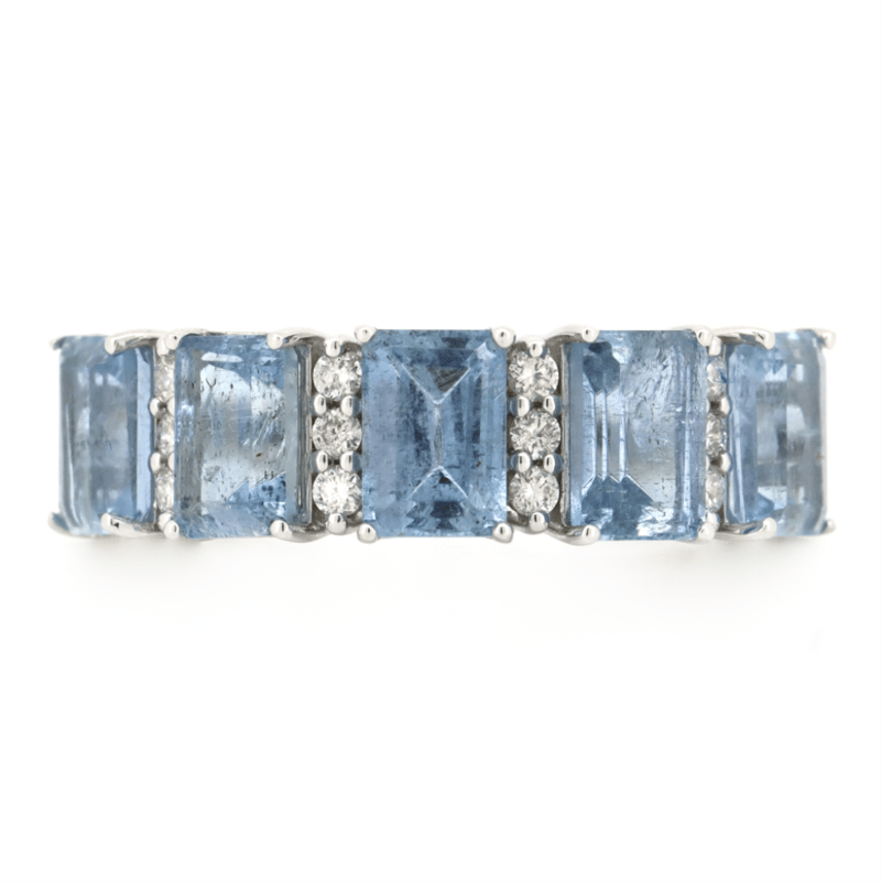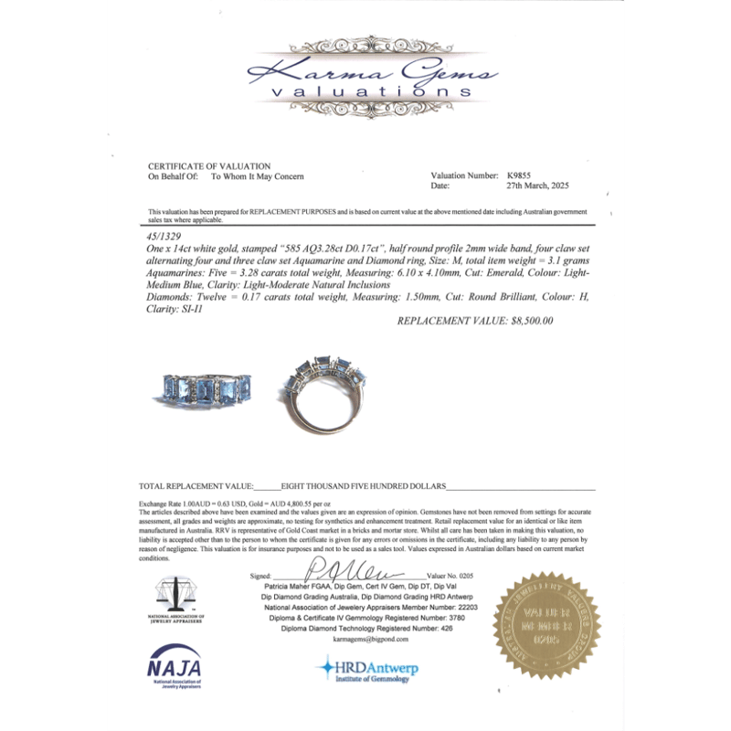 14K WHITE GOLD, AQUAMARINE AND DIAMOND, ETERNITY RING. The Centre Features, One Oval Faceted Cut, Light Fancy Yellow, Diamond (0.46Ct, Si1-Si2 Clarity), 4 Claw Set. Flanking The Centre Are, 2 Pear Brilliant Cut, Light Fancy Yellow, Diamonds (0.40Ct Tdw, Si1-Si2 Clarity), 3 Claw Set In Yellow Gold. Decorating The Band Are, 12 Round Brilliant Cut, Diamonds (0.10Ct Tdw, G-H Colour, Si1-Si2 Clarity), Bead Set In White Gold. Ring Size N 1/2. Valuations Provided by an Independent Third-Party Professional Not Directly Associated With Lloyds Auctions at AUD $$8,500.00This valuation has been conducted by an independent third-party professional. The valuation amount is an assessment by the issuing valuer and does not reflect the auction value of the item. Any inquiries regarding the valuation should be directed to the issuing valuer (refer to contact details on the certificate), as Lloyds Auctions has no affiliation or influence over the valuation, the valuer, or the stated amount. Condition: Good - Refer Images 0+11