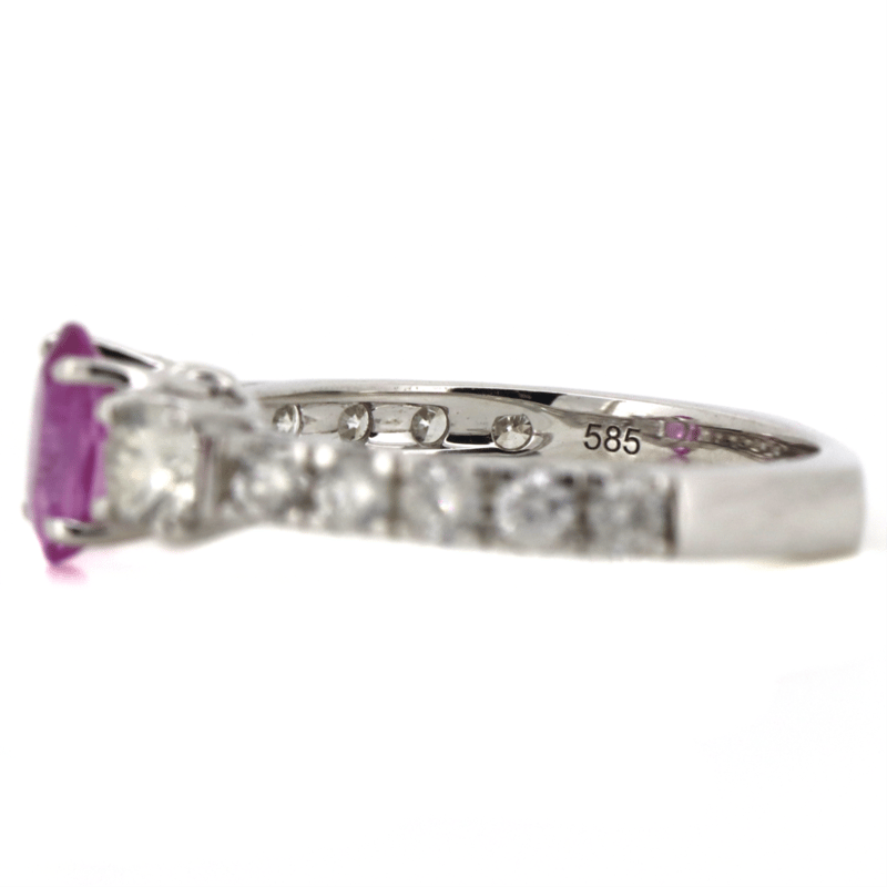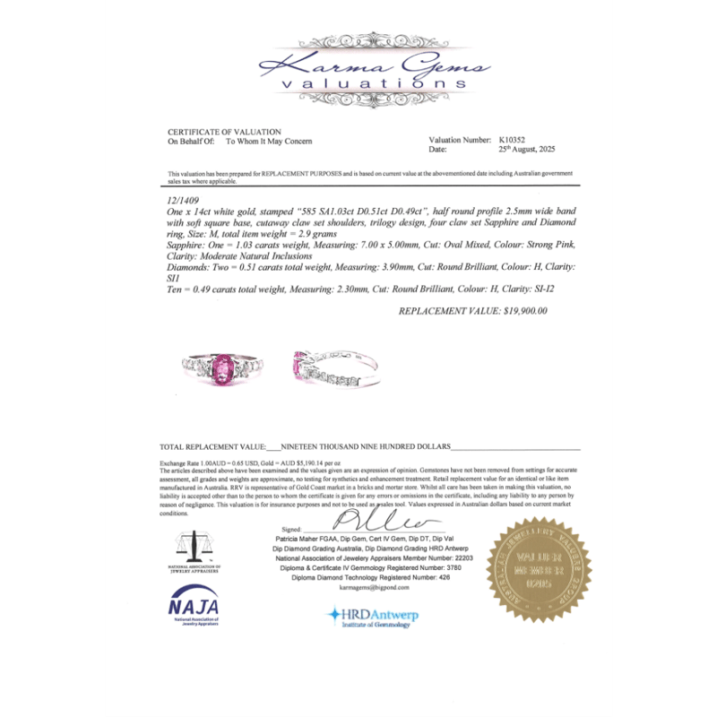 14K WHITE GOLD, PINK SAPPHIRE AND DIAMOND, TRILOGY RING. The Centre Features, One Oval Faceted Cut, Light Fancy Yellow, Diamond (0.46Ct, Si1-Si2 Clarity), 4 Claw Set. Flanking The Centre Are, 2 Pear Brilliant Cut, Light Fancy Yellow, Diamonds (0.40Ct Tdw, Si1-Si2 Clarity), 3 Claw Set In Yellow Gold. Decorating The Band Are, 12 Round Brilliant Cut, Diamonds (0.10Ct Tdw, G-H Colour, Si1-Si2 Clarity), Bead Set In White Gold. Ring Size N 1/2. Valuations Provided by an Independent Third-Party Professional Not Directly Associated With Lloyds Auctions at AUD $$19,900.00This valuation has been conducted by an independent third-party professional. The valuation amount is an assessment by the issuing valuer and does not reflect the auction value of the item. Any inquiries regarding the valuation should be directed to the issuing valuer (refer to contact details on the certificate), as Lloyds Auctions has no affiliation or influence over the valuation, the valuer, or the stated amount. Condition: Good - Refer Images 0+2