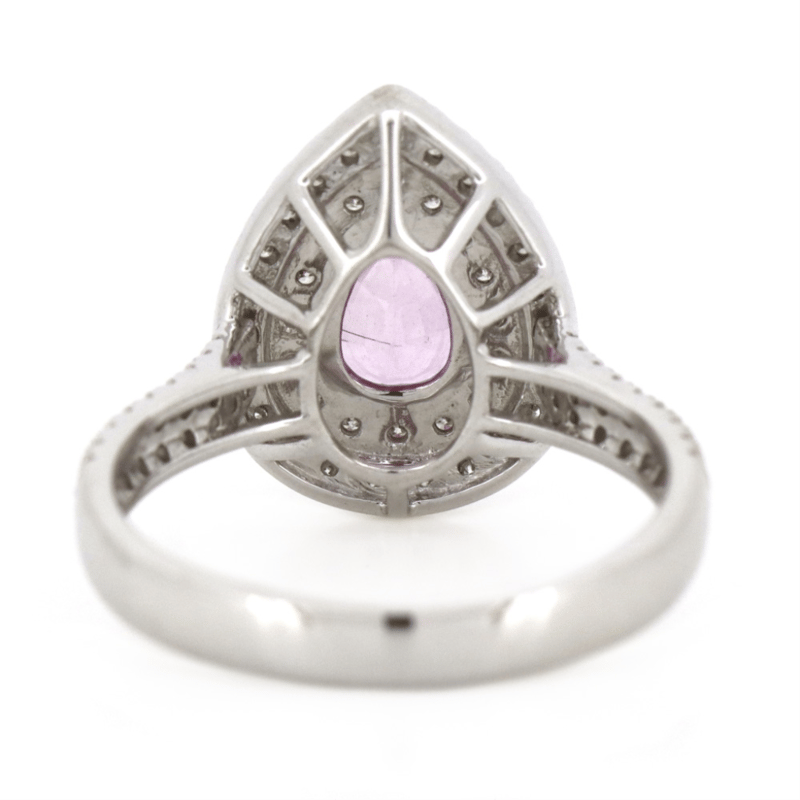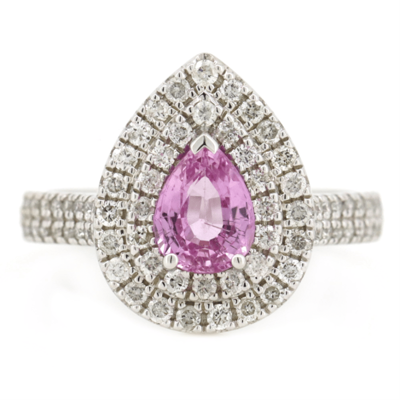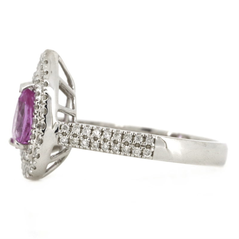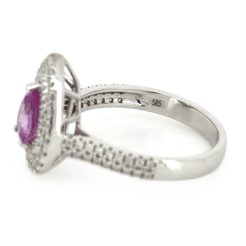 14K WHITE GOLD, PINK SAPPHIRE AND DIAMOND, DOUBLE HALO RING.