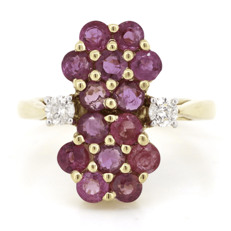 14K YELLOW GOLD, PINK SAPPHIRE AND DIAMOND, FLORAL RING.