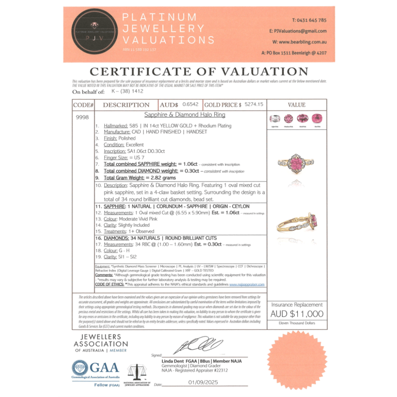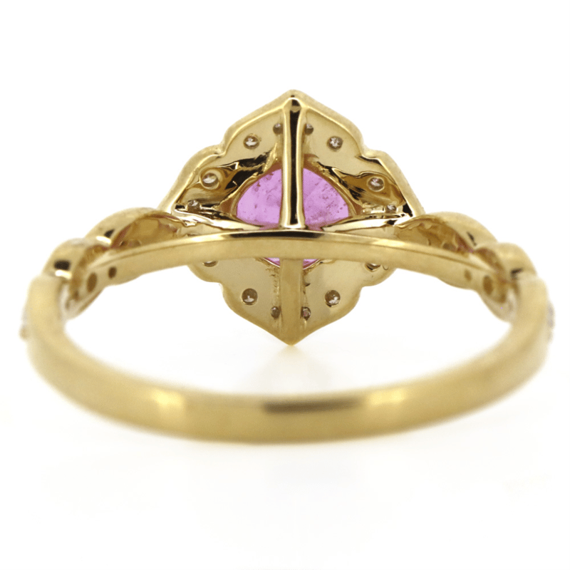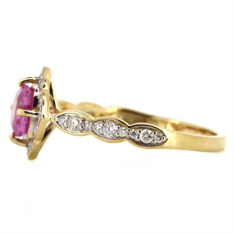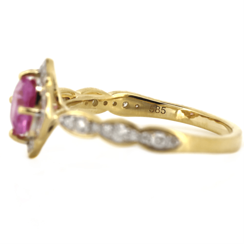 14K YELLOW GOLD, PINK SAPPHIRE AND DIAMOND, HALO RING.