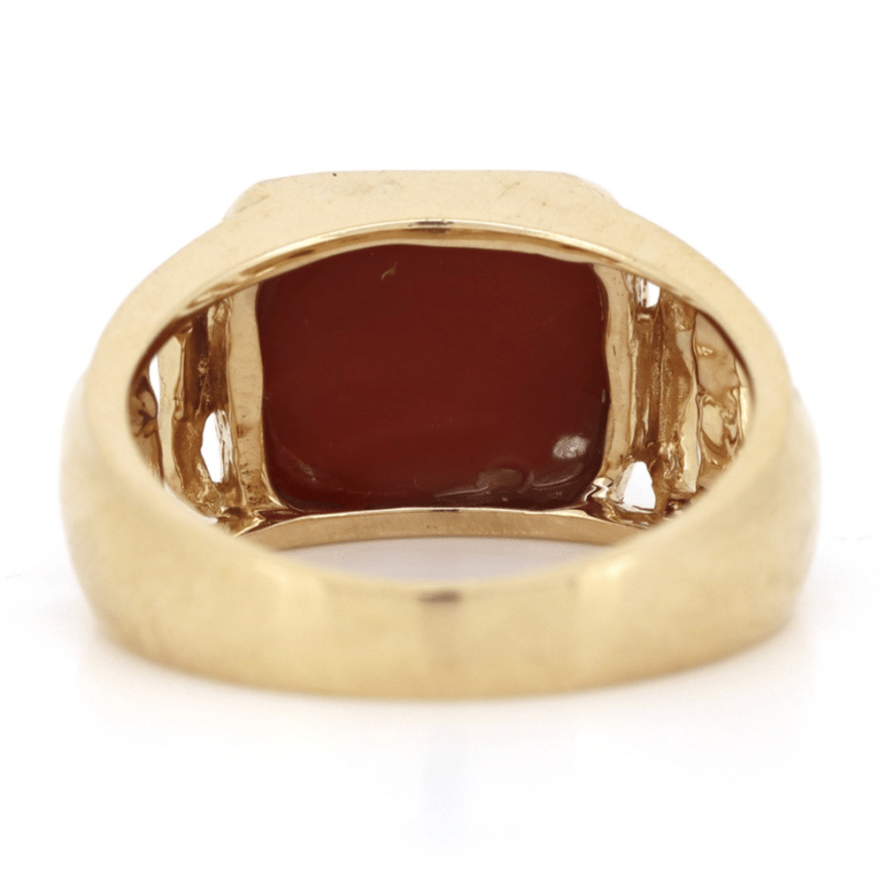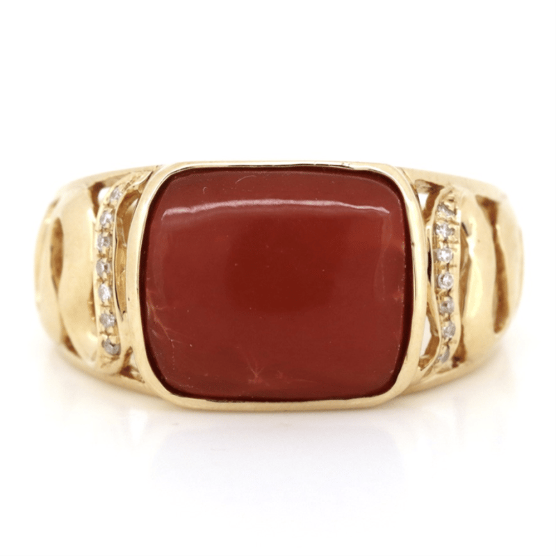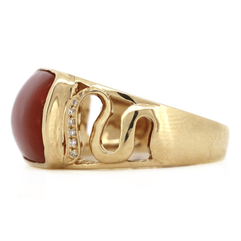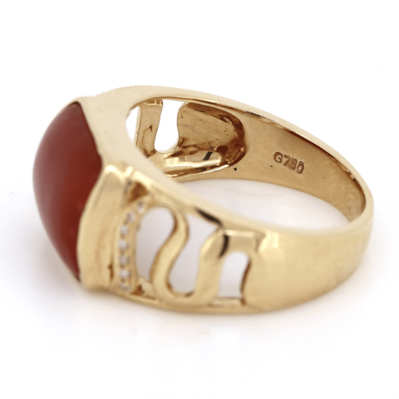 18K ROSE GOLD, CARNELIAN AND DIAMOND, SWIRL BAND RING.