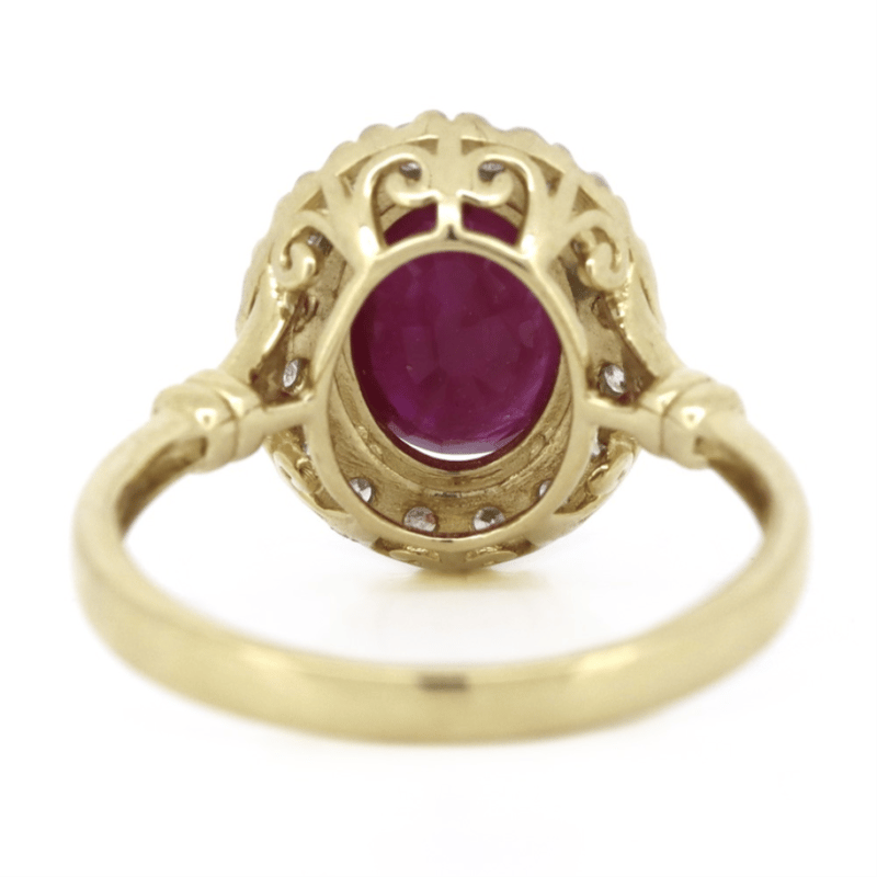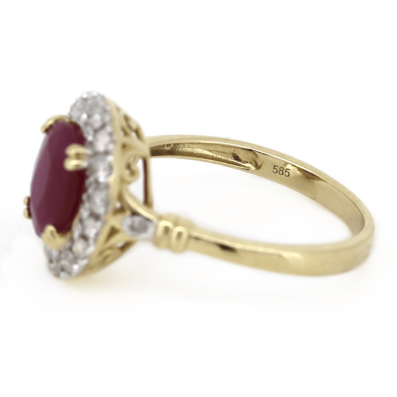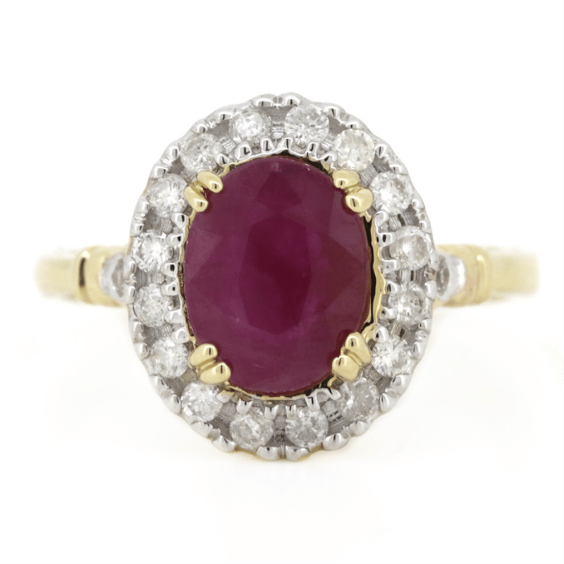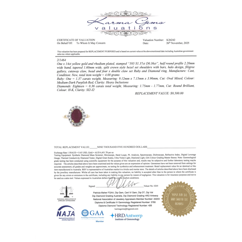 14K YELLOW GOLD, RUBY AND DIAMOND, DECORATIVE HALO RING. The Centre Features, One Oval Faceted Cut, Light Fancy Yellow, Diamond (0.46Ct, Si1-Si2 Clarity), 4 Claw Set. Flanking The Centre Are, 2 Pear Brilliant Cut, Light Fancy Yellow, Diamonds (0.40Ct Tdw, Si1-Si2 Clarity), 3 Claw Set In Yellow Gold. Decorating The Band Are, 12 Round Brilliant Cut, Diamonds (0.10Ct Tdw, G-H Colour, Si1-Si2 Clarity), Bead Set In White Gold. Ring Size N 1/2. Valuations Provided by an Independent Third-Party Professional Not Directly Associated With Lloyds Auctions at AUD $$9,500.00This valuation has been conducted by an independent third-party professional. The valuation amount is an assessment by the issuing valuer and does not reflect the auction value of the item. Any inquiries regarding the valuation should be directed to the issuing valuer (refer to contact details on the certificate), as Lloyds Auctions has no affiliation or influence over the valuation, the valuer, or the stated amount. Condition: Good - Refer Images 0+86