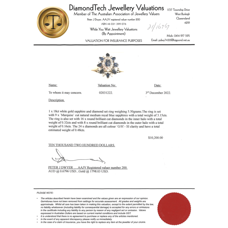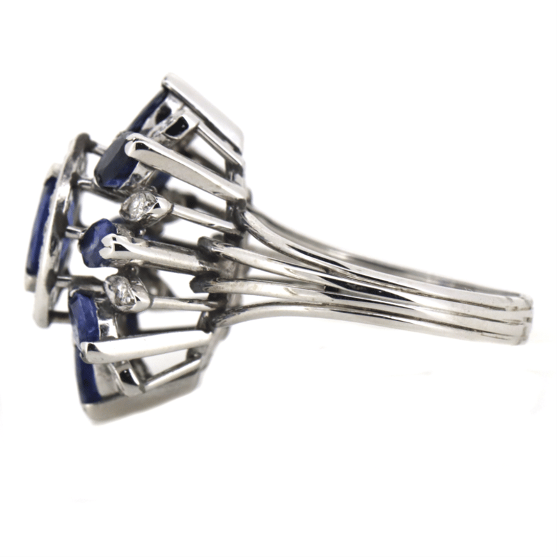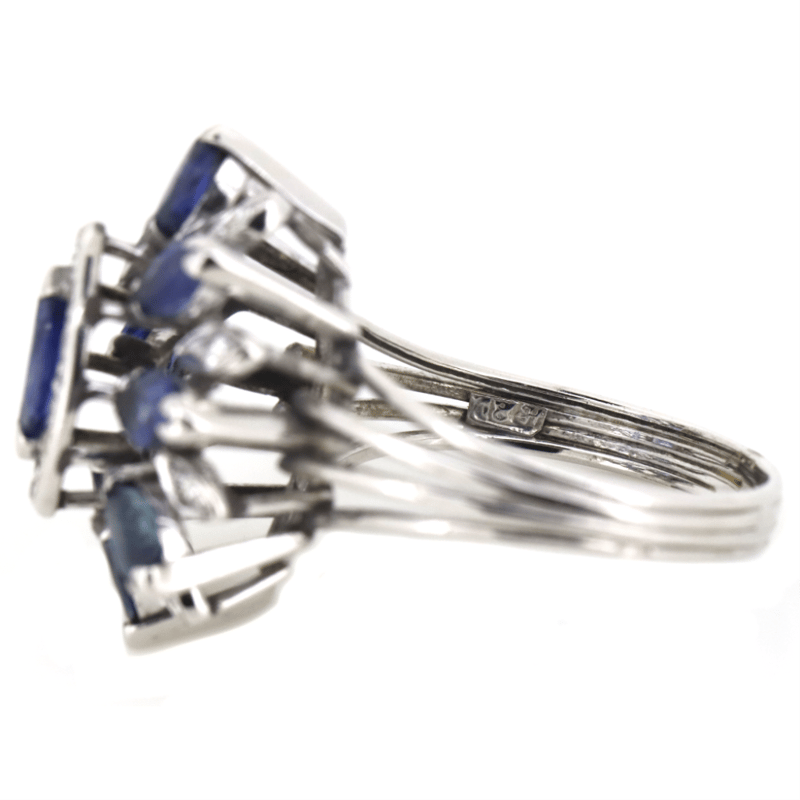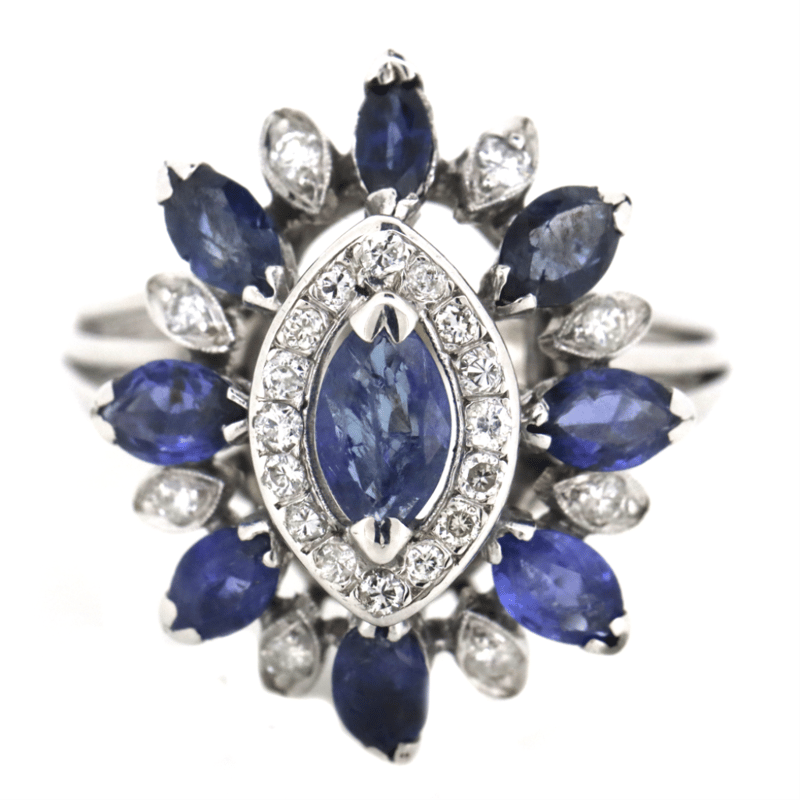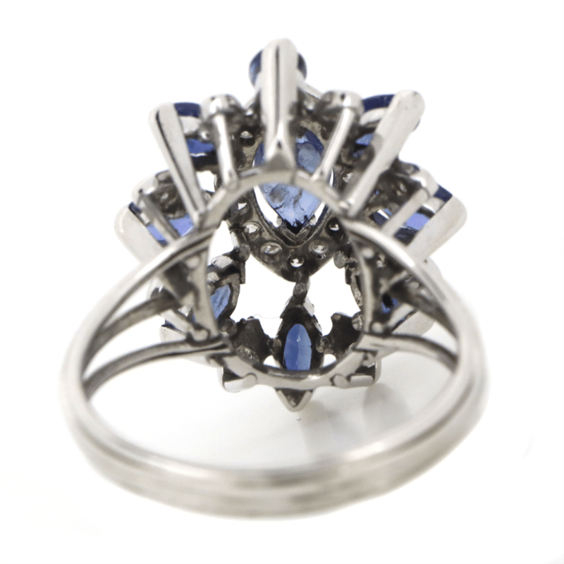 18K WHITE GOLD, SAPPHIRE AND DIAMOND, FLORAL RING. The Centre Features, 9 Marquise Cut, Sapphires (3.15Ct Tsw, Inclusions), Claw Set. Encompassing The Centre Are, 24 Round Brilliant Cut, Diamonds (0.48Ct Tdw, G-H Colour, Si Clarity), Claw Set. Ring Size P 1/2. Condition: Pre-Owned. Condition: Good - Refer Images 0+1529
