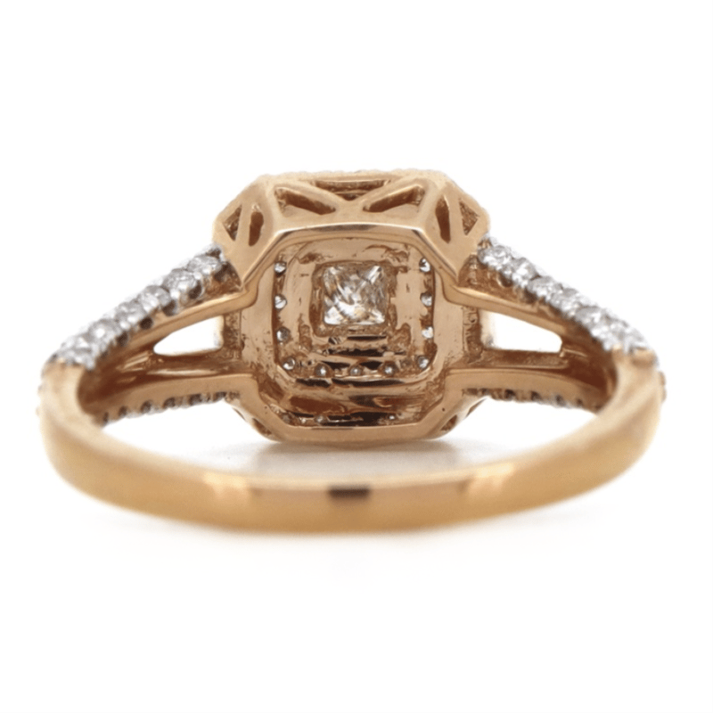 14K ROSE GOLD AND DIAMOND, DOUBLE HALO SPLIT BAND RING. The Centre Features, One Princess Cut, Diamond (0.21Ct, J Colour, P1 Clarity), 4 Claw Set. Surrounding The Centre In A Double Halo And Decorating The Band Are, 100 Round Brilliant Cut, Diamonds (0.61Ct Tdw, H-J Colour, Si2 -P2 Clarity), Claw Set. Ring Size L. Valuations Provided by an Independent Third-Party Professional Not Directly Associated With Lloyds Auctions at AUD $$8,960.00This valuation has been conducted by an independent third-party professional. The valuation amount is an assessment by the issuing valuer and does not reflect the auction value of the item. Any inquiries regarding the valuation should be directed to the issuing valuer (refer to contact details on the certificate), as Lloyds Auctions has no affiliation or influence over the valuation, the valuer, or the stated amount. Condition: Good - Refer Images 0+1536