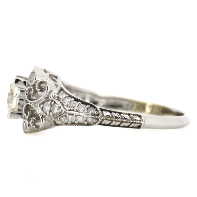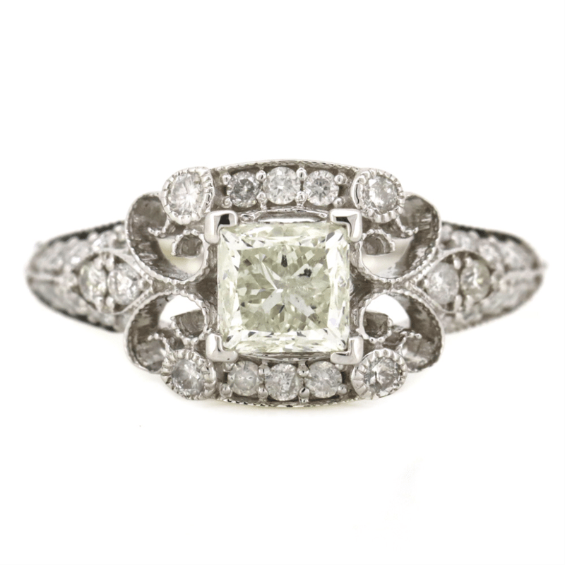 The Centre Features, One Square Princess Cut, Diamond (0.75Ct, K-L Colour, P2 Clarity), Claw Set. Decorating The Design Are, 32 Round Brilliant Cut, Diamonds (0.35Ct Tdw, H-K Colour, P2+ Clarity), Bead Set. Ring Size L 1/2.