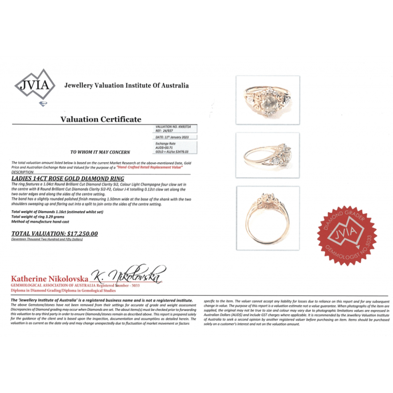 The Centre Features, One Round Brilliant, Light Champagne, Diamond (1.04Ct, Si2 Clarity), Claw Set. Encompassing The Design Are, 8 Round Brilliant Cut, Diamonds (0.12Ct Tdw, J-K Colour, Si2-P2 Clarity), Claw Set. Ring Size M.