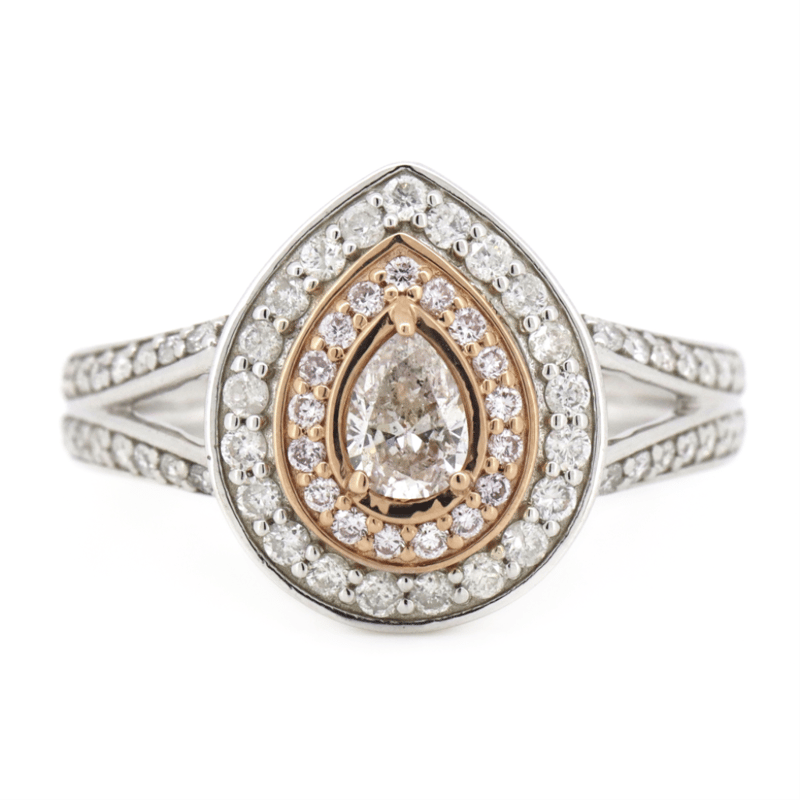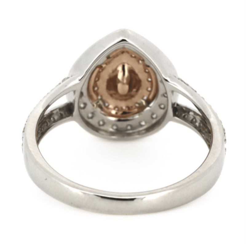The Centre Features, One Pear Modified Brilliant Cut, Pink Champagne, Diamond (0.27Ct, Si2-P1 Clarity), Claw Set In Rose Gold. Surrounding The Centre In Halo Are, 17 Round Brilliant Cut, Blush Pink, Diamonds (0.06Ct Tdw, Si2+ Clarity), Bead Set In Rose Gold. Encompassing The Design Are, 53 Round Brilliant Cut, Diamonds (0.39Ct Tdw, H-K Colour, P1+ Clarity), Bead Set In White Gold. Ring Size M.
