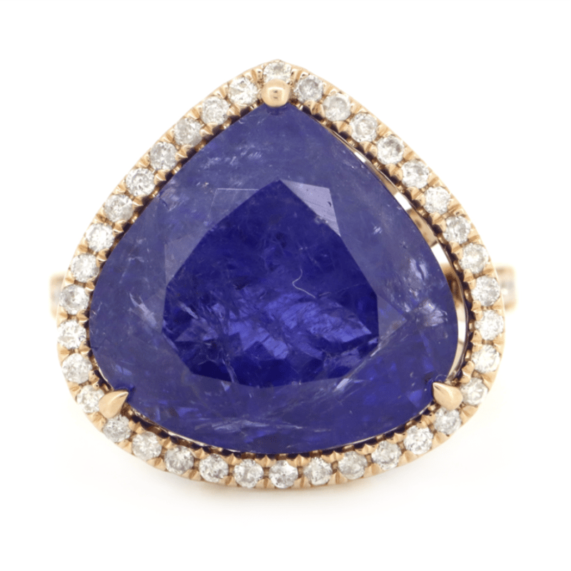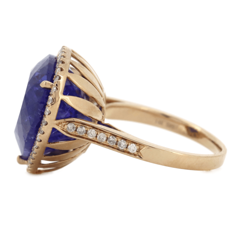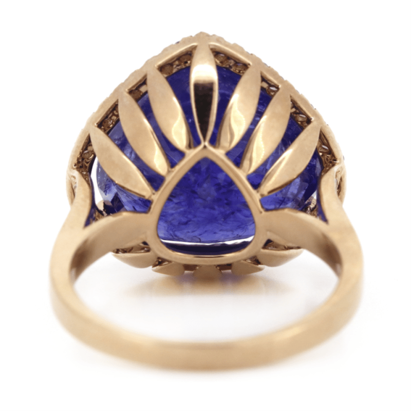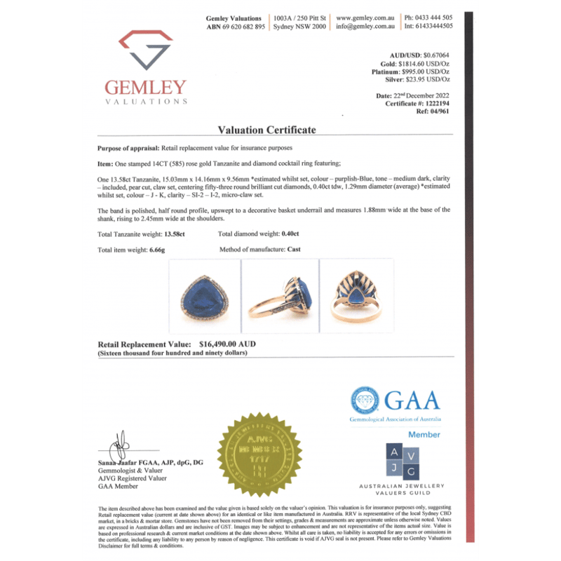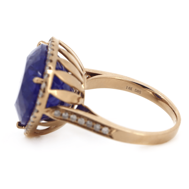 14K ROSE GOLD, TANZANITE AND DIAMOND, HALO RING. The Centre Features, One Pear Cut, Purplish-Blue, Tanzanite (13.58Ct, Included), Claw Set. Surrounding The Centre In A Halo And Decorating The Band Are, 53 Round Brilliant Cut, Diamonds (0.40Ct Tdw, J-K Colour, Si2-I2 Clarity), Claw Set. Ring Size M. Valuations Provided by an Independent Third-Party Professional Not Directly Associated With Lloyds Auctions at AUD $$16,490.00This valuation has been conducted by an independent third-party professional. The valuation amount is an assessment by the issuing valuer and does not reflect the auction value of the item. Any inquiries regarding the valuation should be directed to the issuing valuer (refer to contact details on the certificate), as Lloyds Auctions has no affiliation or influence over the valuation, the valuer, or the stated amount. Condition: Good - Refer Images 0+1579