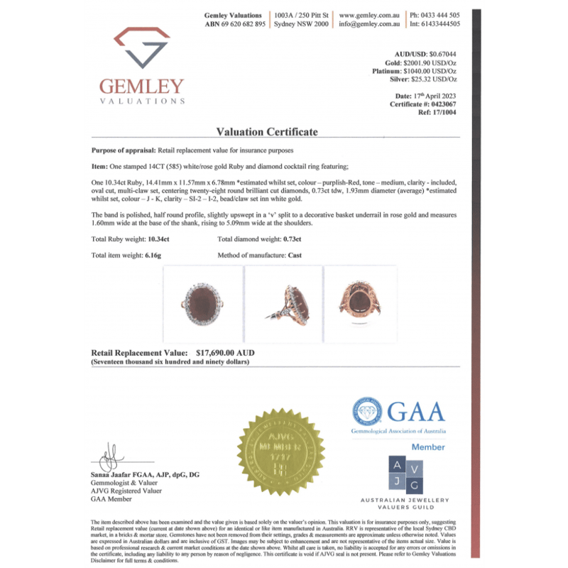 The Centre Features, One Oval Cut, Purplish-Red, Ruby (10.34Ct, Included), Multi-Claw Set. Surrounding The Centre In A Halo And Decorating The Shoulders Are, 28 Round Brilliant Cut, Diamonds (0.73Ct Tdw, J-K Colour, Si2-I2 Clarity), Bead/Claw Set In White Gold. Ring Size N.