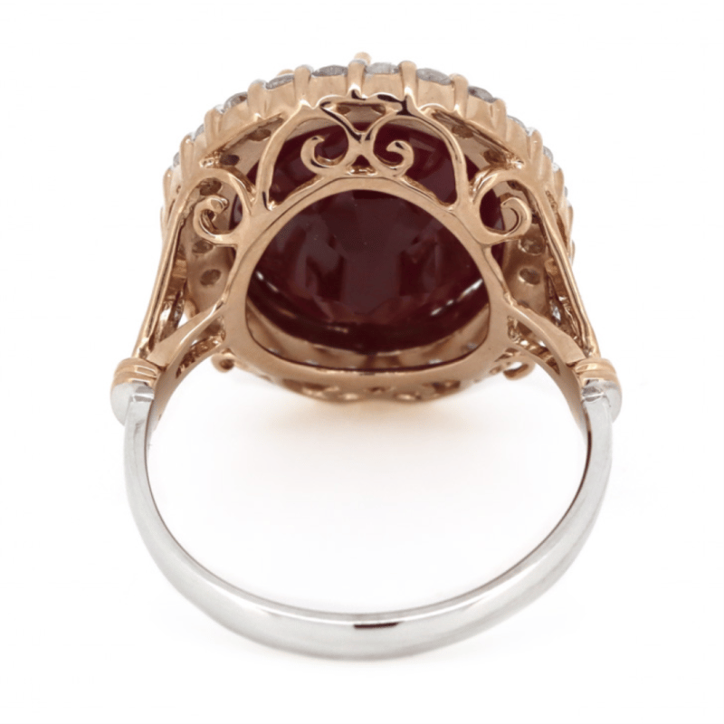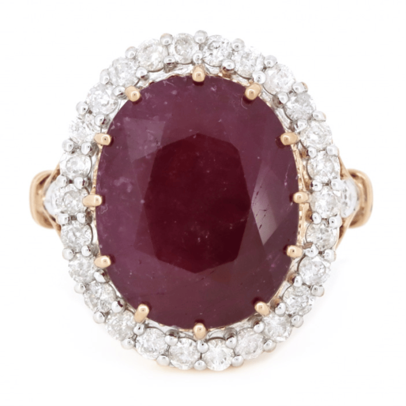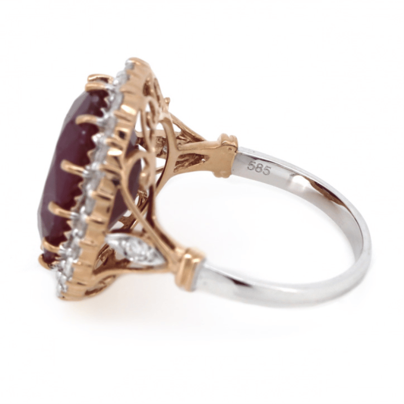 14K WHITE/ROSE GOLD, 10.34CT RUBY AND DIAMOND, HALO RING.