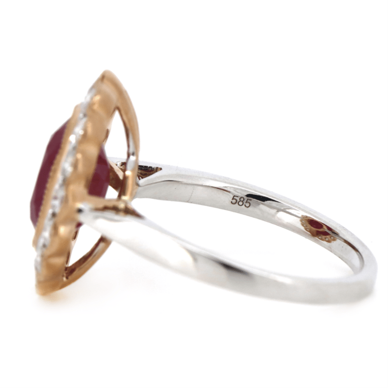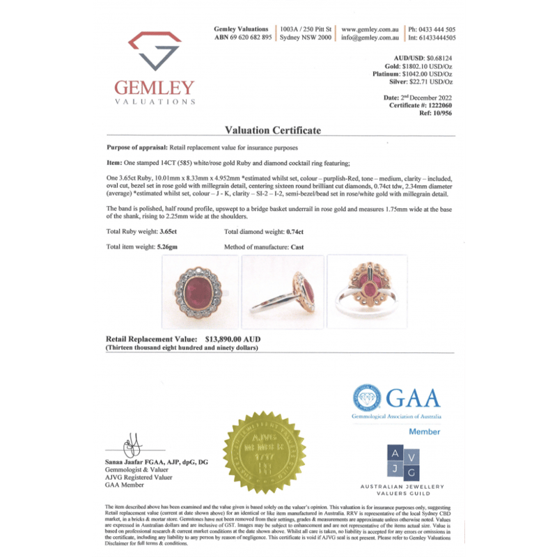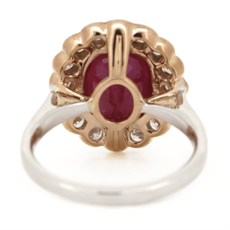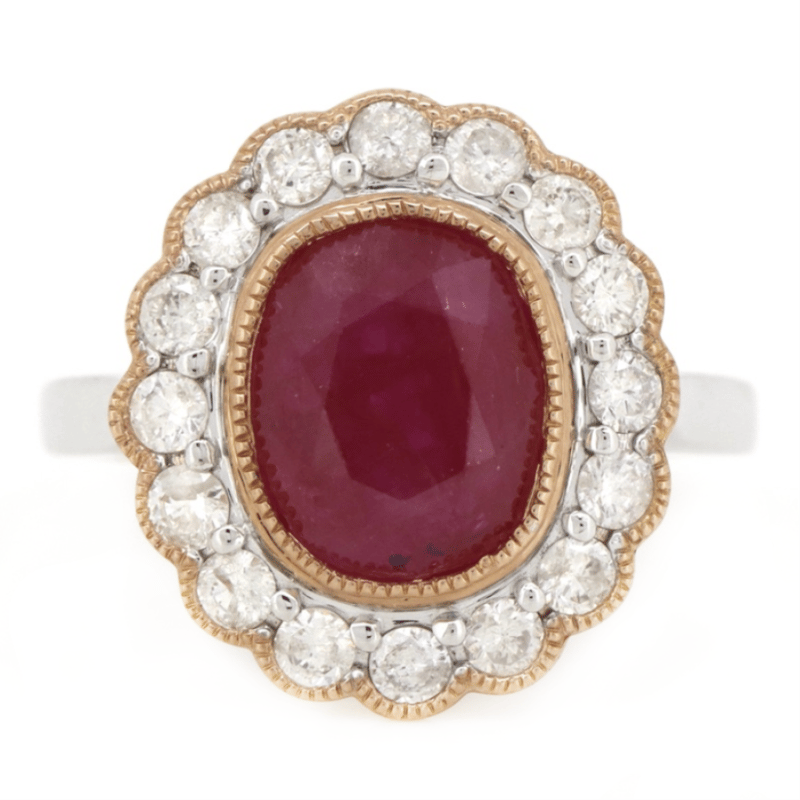 14K WHITE/ROSE GOLD, RUBY AND DIAMOND, HALO RING. The Centre Features, One Oval Cut, Medium Purplish-Red, Ruby (3.65Ct, Included), Bezel Set In Rose Gold With Millegrain Detail. Surrounding The Centre In A Halo Are, 16 Round Brilliant Cut, Diamonds (0.74Ct Tdw, J-K Colour, Si2-I1 Clarity), Semi-Bezel/Bead Set In Rose/White Gold With Millegrain Detail. Ring Size N. Valuations Provided by an Independent Third-Party Professional Not Directly Associated With Lloyds Auctions at AUD $$13,890.00This valuation has been conducted by an independent third-party professional. The valuation amount is an assessment by the issuing valuer and does not reflect the auction value of the item. Any inquiries regarding the valuation should be directed to the issuing valuer (refer to contact details on the certificate), as Lloyds Auctions has no affiliation or influence over the valuation, the valuer, or the stated amount. Condition: Good - Refer Images 0+1566