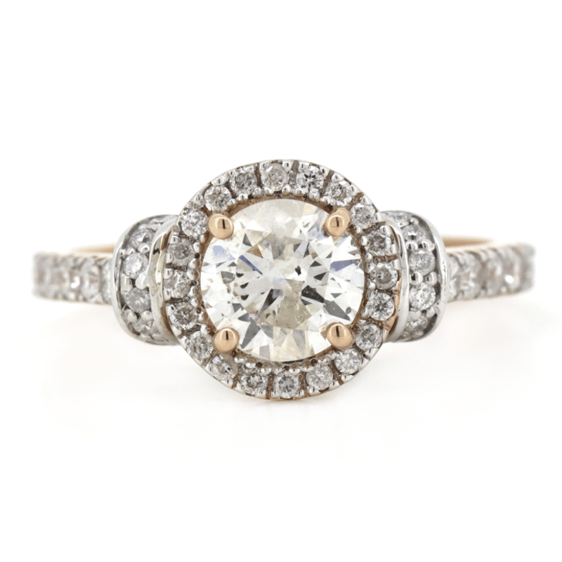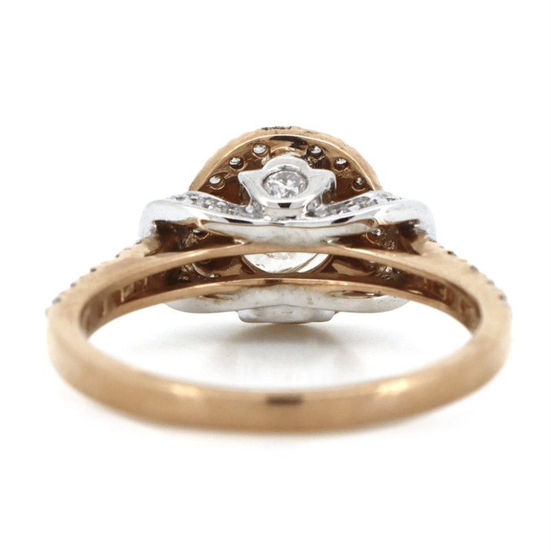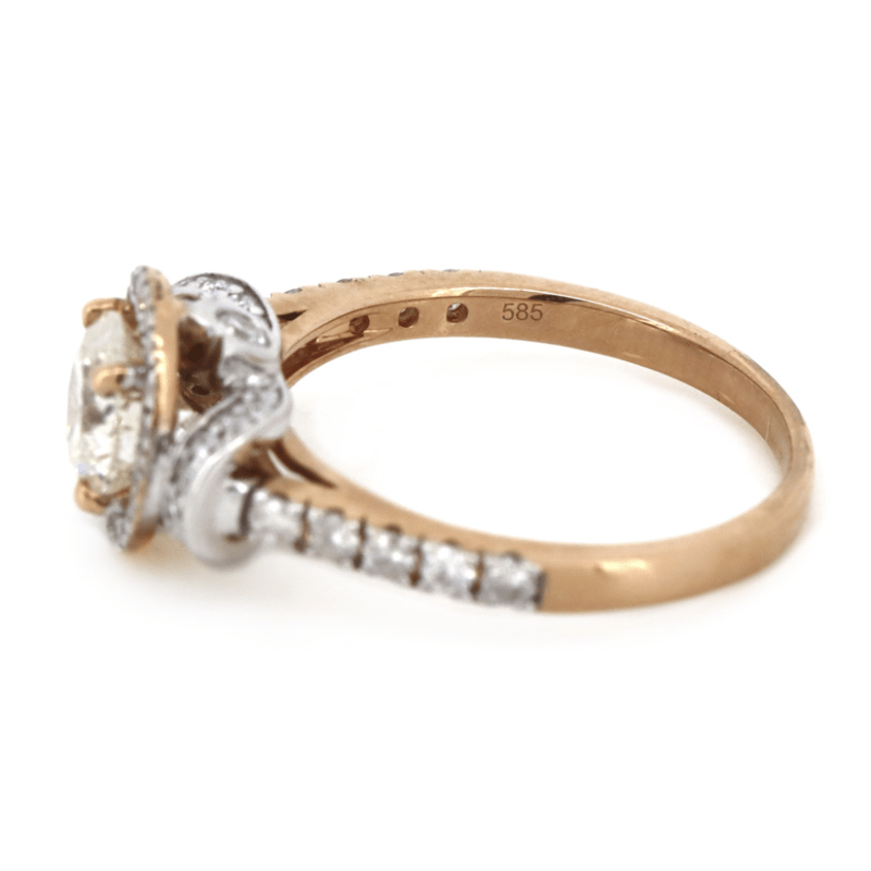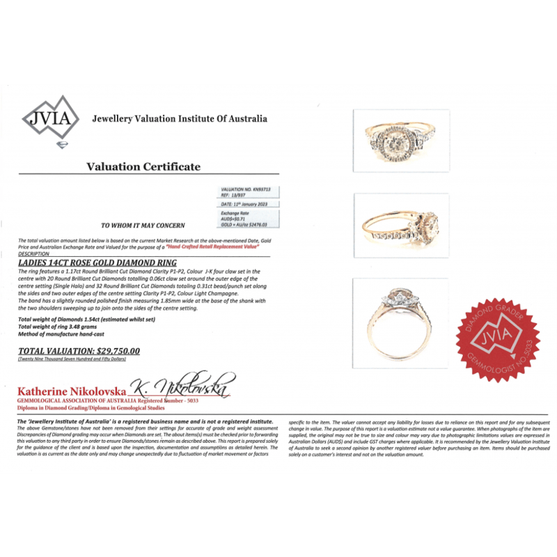 14K ROSE GOLD AND DIAMOND, HALO RING. The Centre Features, One Round Brilliant Cut, Diamond (1.17Ct Tdw, J-K Colour, P1-P2 Clarity), 4 Claw Set. Decorating The Setting And The Band Are, 52 Round Brilliant Cut, Light Champagne, Diamonds (0.37Ct Tdw, P1-P2 Clarity), Claw/Bead/Punch Set. Ring Size M. Valuations Provided by an Independent Third-Party Professional Not Directly Associated With Lloyds Auctions at AUD $$29,750.00This valuation has been conducted by an independent third-party professional. The valuation amount is an assessment by the issuing valuer and does not reflect the auction value of the item. Any inquiries regarding the valuation should be directed to the issuing valuer (refer to contact details on the certificate), as Lloyds Auctions has no affiliation or influence over the valuation, the valuer, or the stated amount. Condition: Good - Refer Images 0+172