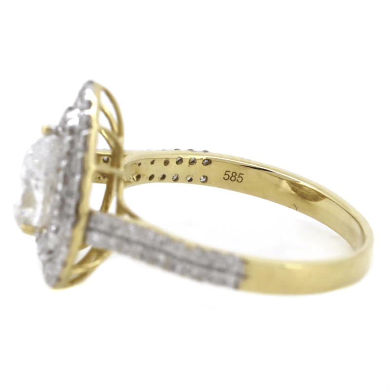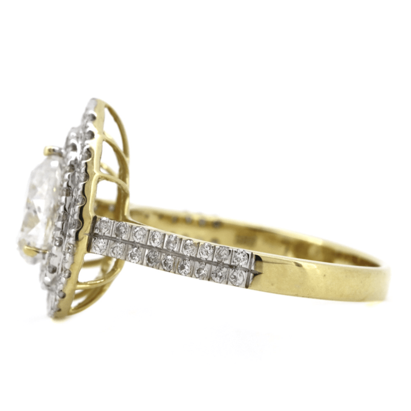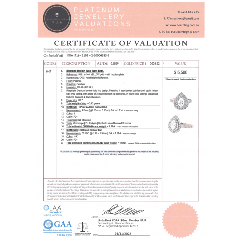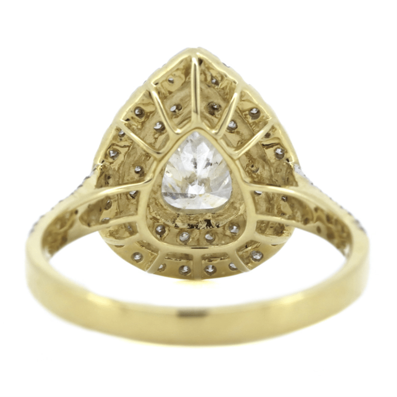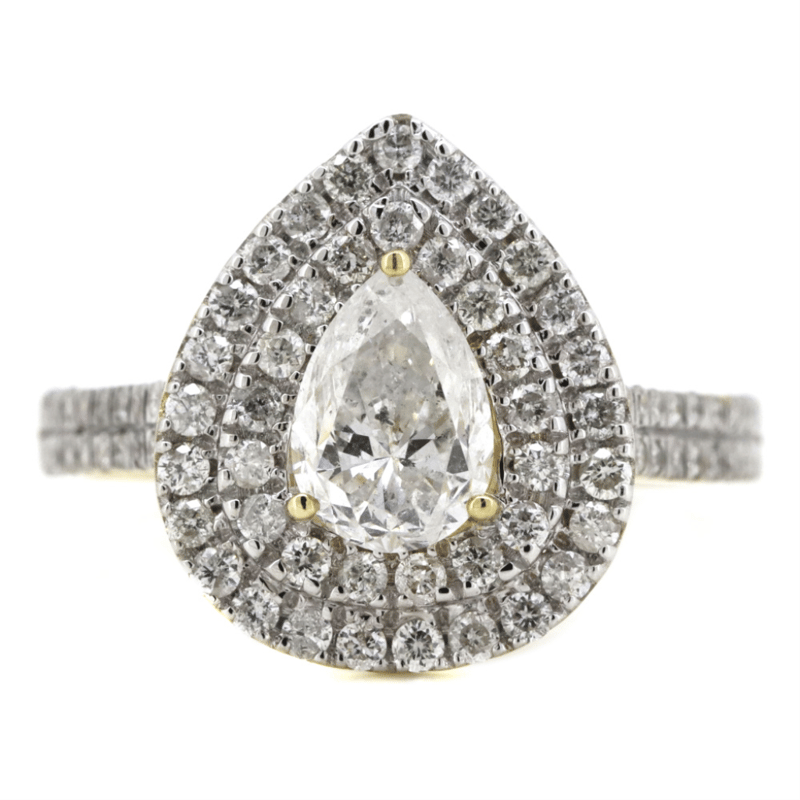 The Centre Features, One Pear Faceted Cut, Diamond (1.01Ct, J Colour, P2+ Clarity), 3 Claw Set. Surrounding The Centre In A Double Halo And Decorating The Band Are, 78 Round Brilliant Cut, Diamonds (0.59Ct Tdw, H-K Colour, P2+ Clarity), Micro Bead Set. Ring Size N.