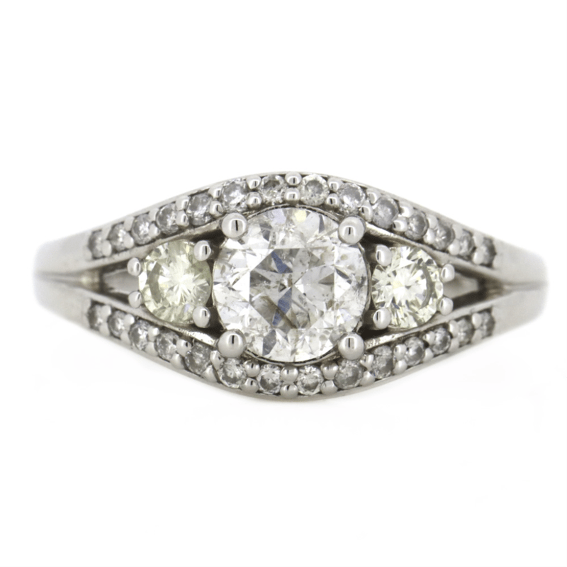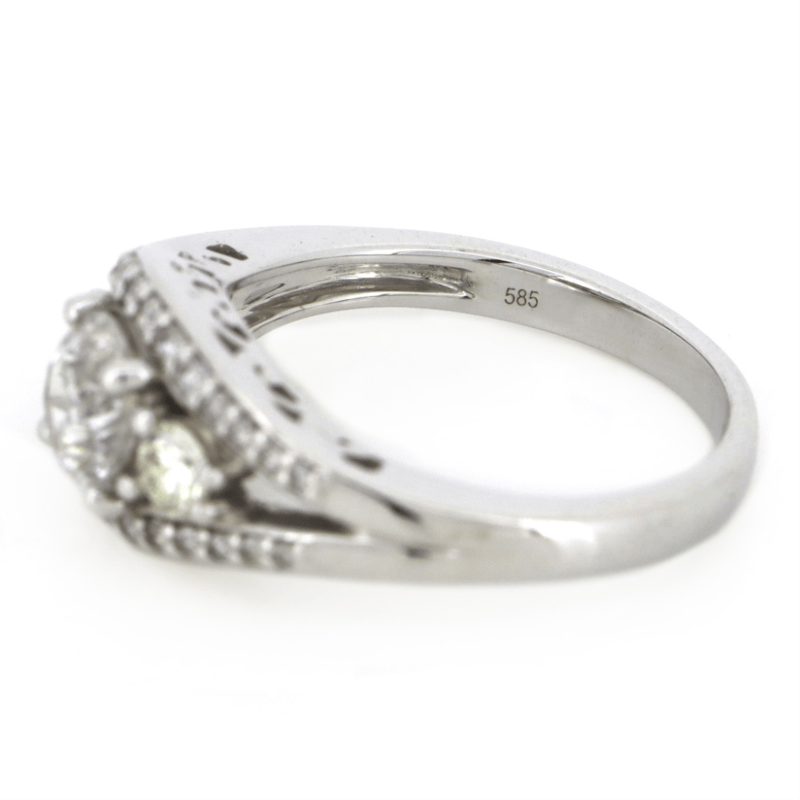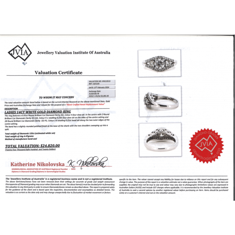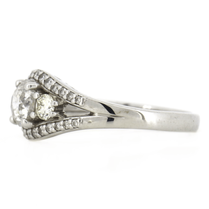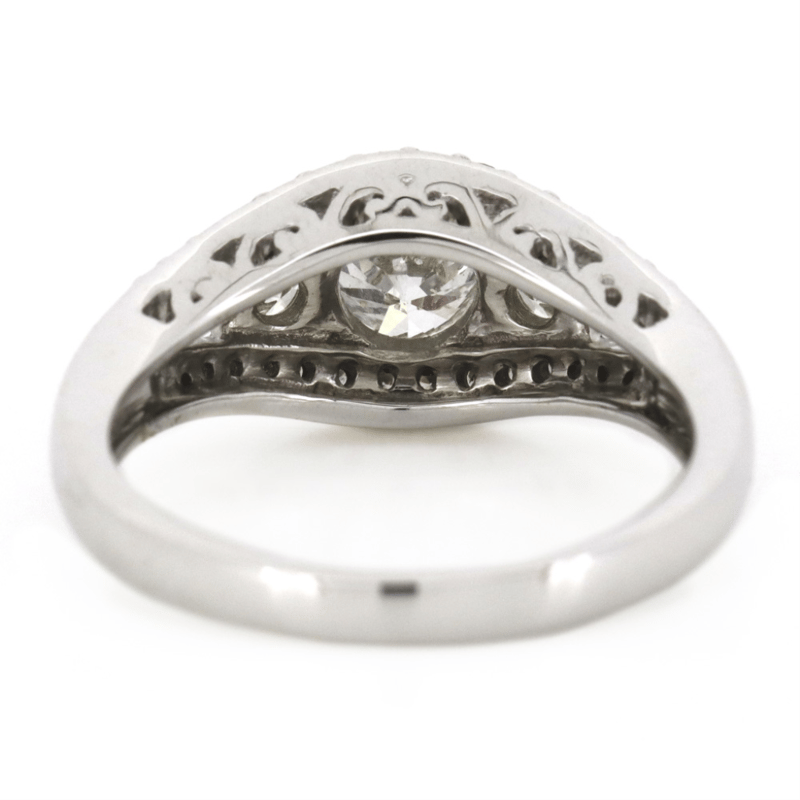 The Centre Features, One Round Brilliant Cut, Diamond (0.91Ct, H Colour, I2 Clarity), Claw Set. Flanking Either Side Of The Centre Are, 2 Round Brilliant Cut, Diamonds (0.23Ct Tdw, K-L Colour, Si1 Clarity), Claw Set. Bordering The Central Design Are, 28 Round Brilliant Cut, Diamonds (0.21Ct Tdw, J-K Colour, Si2-P2 Clarity), Bead Set. Ring Size N.