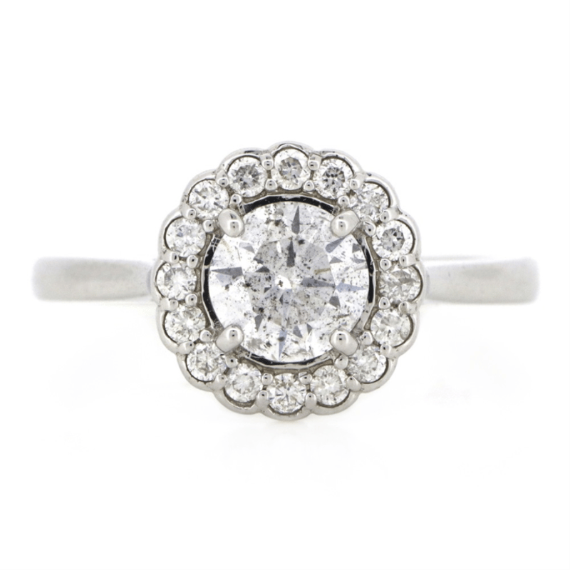 The Centre Features, One Round Brilliant Cut, Diamond (0.91Ct, I-J Colour, P1-P2 Clarity), 4 Claw Set. Surrounding The Centre In A Halo Are, 16 Round Brilliant Cut, Diamonds (0.24Ct Tdw, I-J Colour, P1-P2 Clarity), Micro-Bead Set. Ring Size M 1/2.
