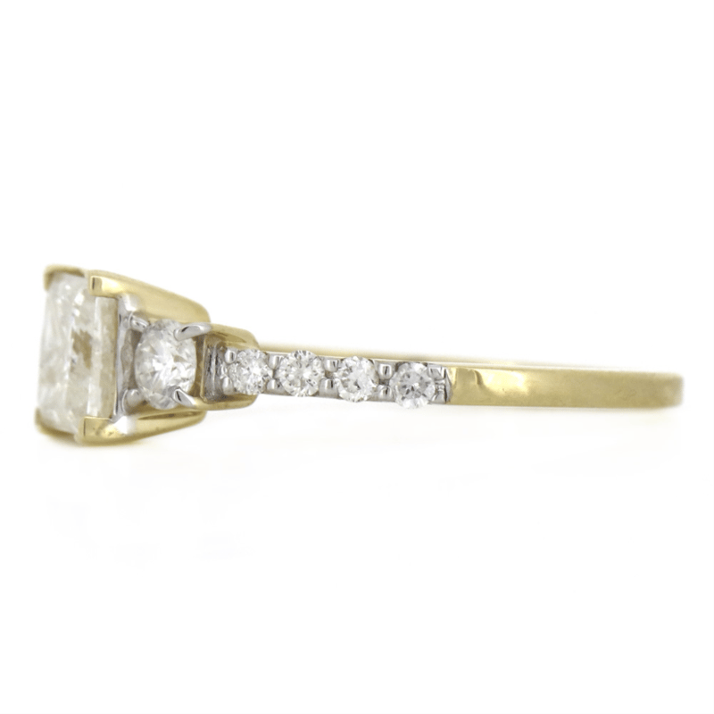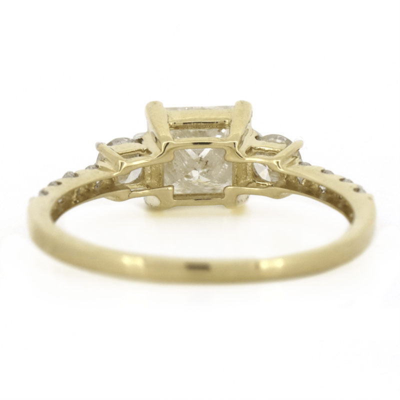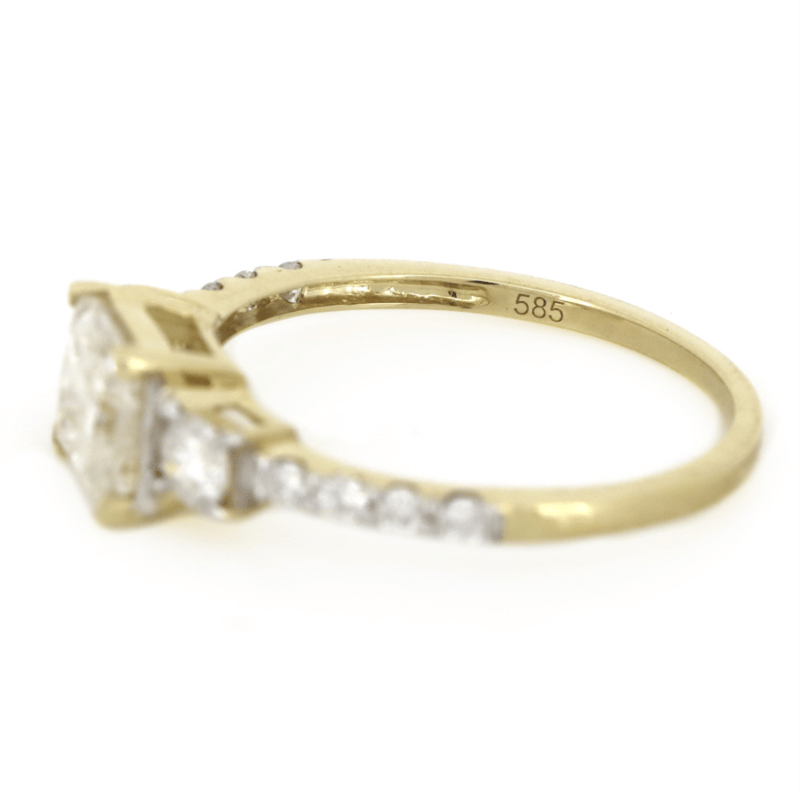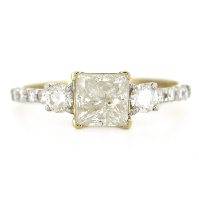 The Centre Features, One Princess Cut, Diamond (0.98Ct, H-I Colour, I2 Clarity,), Claw Set. Flanking The Centre Are, 2 Round Brilliant Cut, Diamonds (0.26Ct Tdw, H Colour, Si1-2 Clarity), Claw Set. Decorating The Band Are, 8 Round Brilliant Cut, Diamonds (0.15Ct Tdw, G-H Colour, Si-I1 Clarity), Pip-Claw Set. Ring Size N.