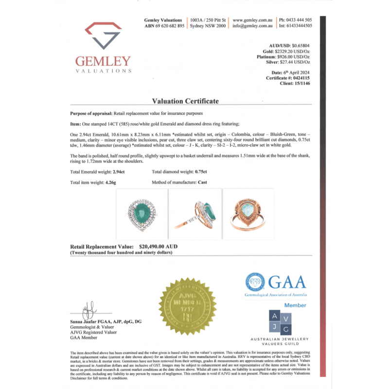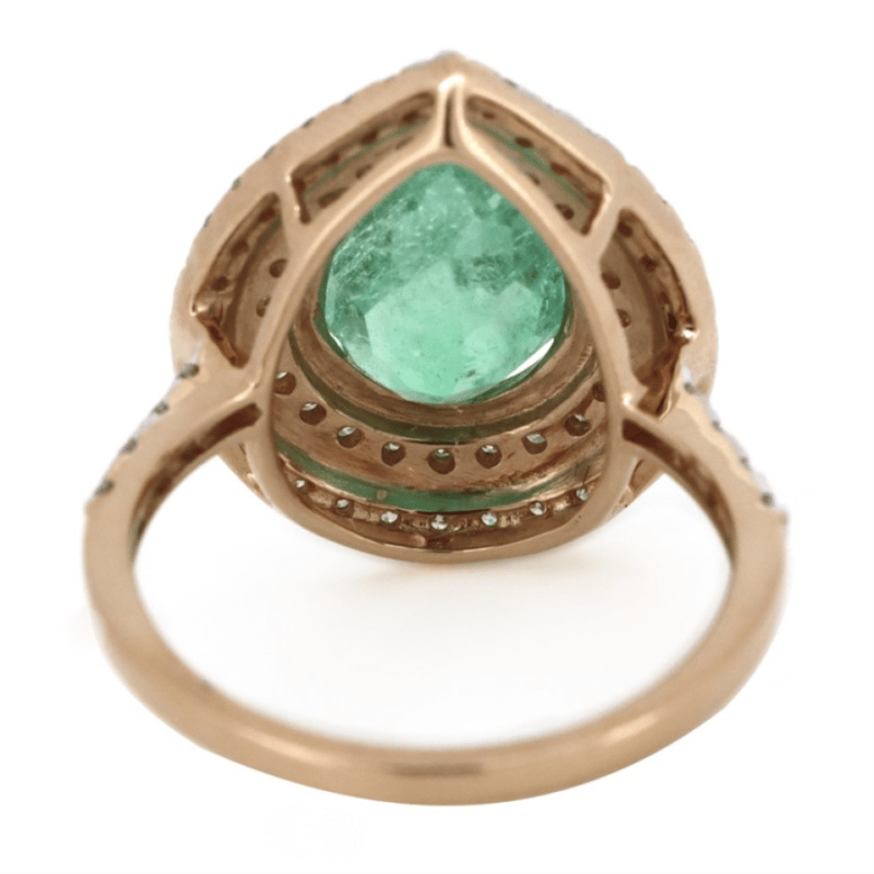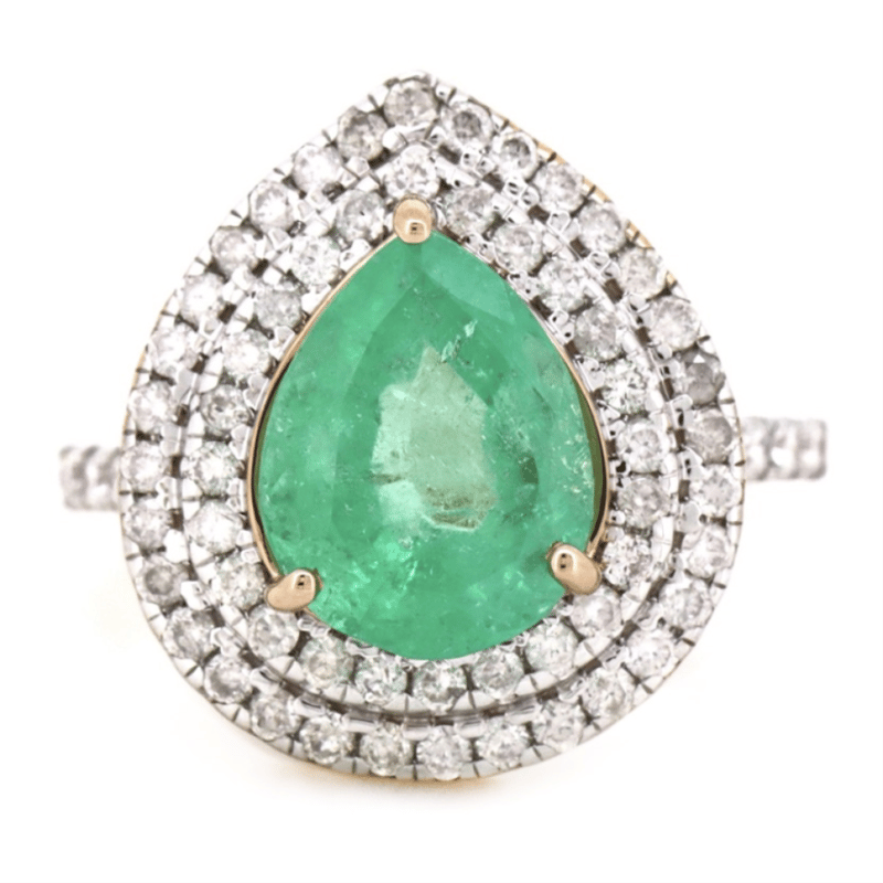 The Centre Features, One Pear Cut, Medium Bluish-Green, Colombian Emerald (2.94Ct, Minor Eye Visible Inclusions), 3 Claw Set. Surrounding The Centre In A Double Halo And Decorating The Band Are, 64 Round Brilliant Cut, Diamonds (0.75Ct Tdw, J-K Colour, Si2-I2 Clarity), Micro-Claw Set In White Gold. Ring Size L 1/2.