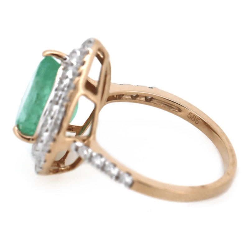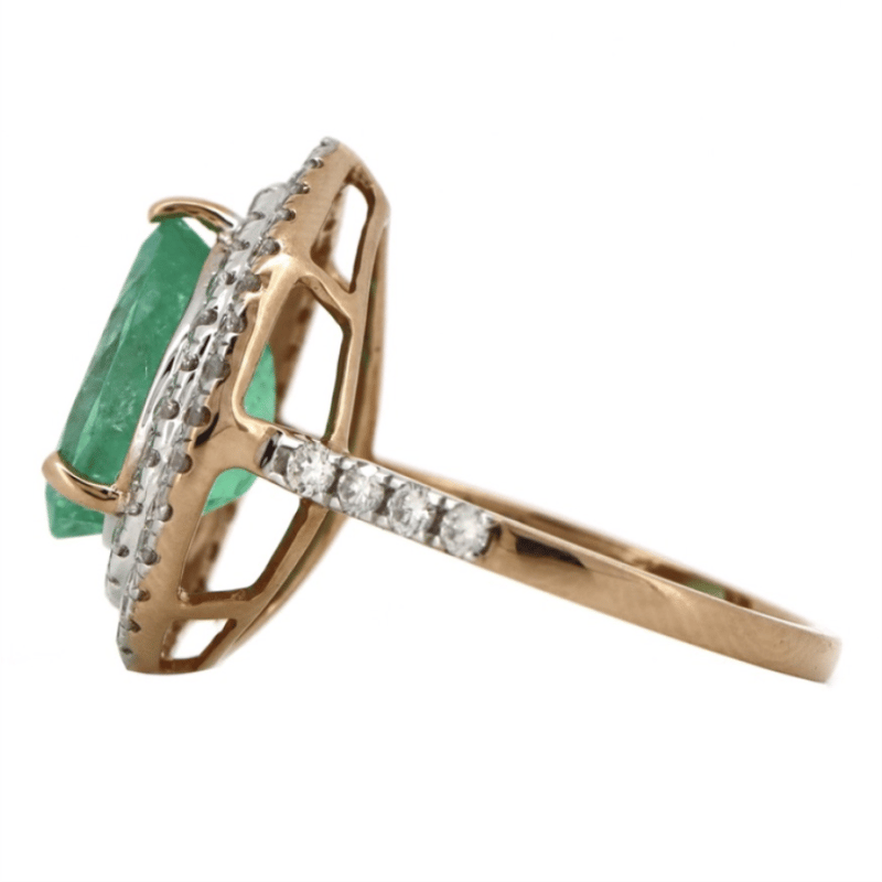 14K ROSE/WHITE GOLD, 2.94CT COLOMBIAN EMERALD AND DIAMOND, DOUBLE HALO RING.