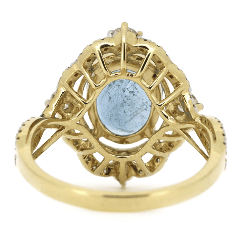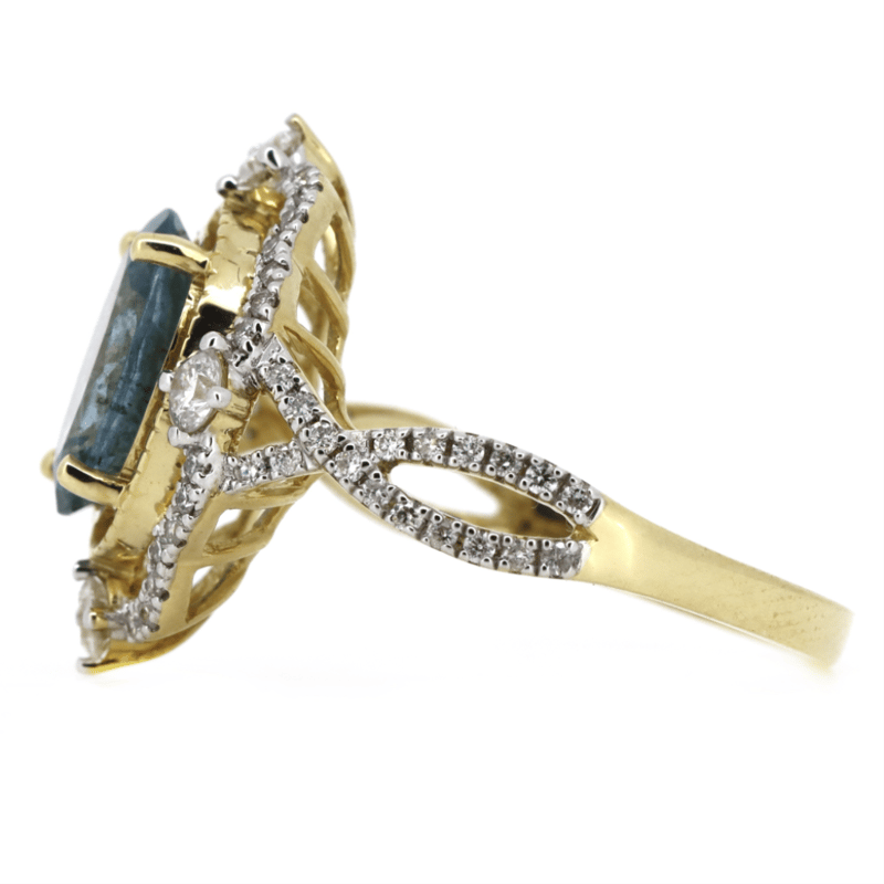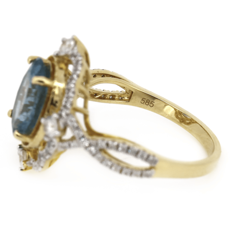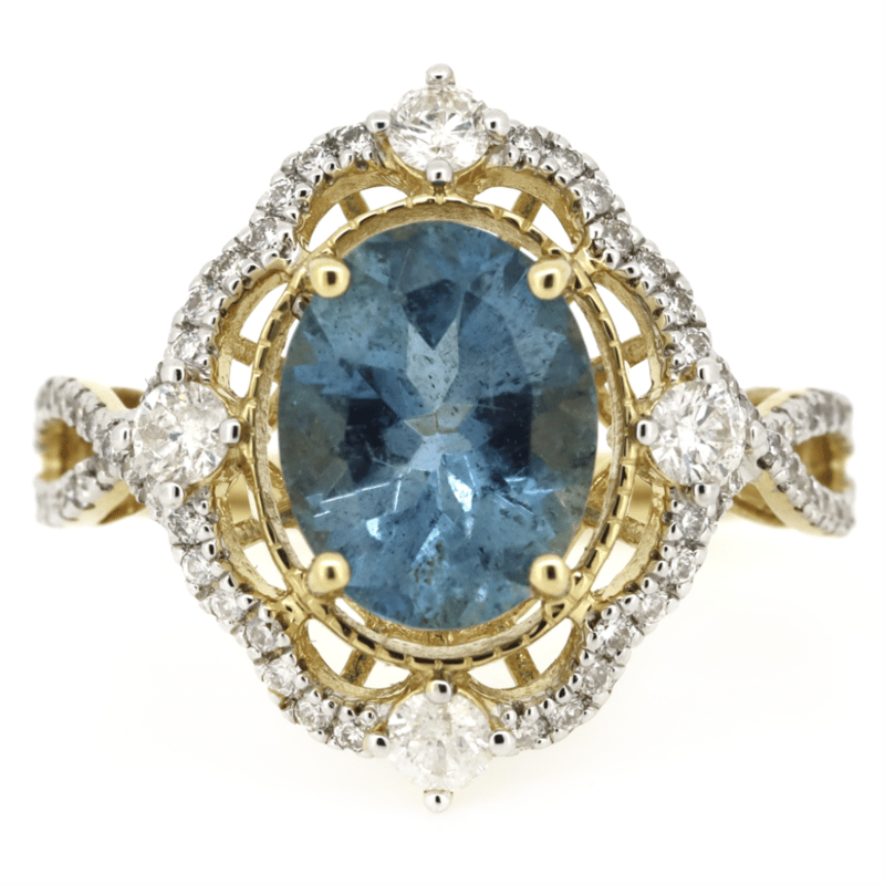 The Centre Features, One Oval Cut, Deep Moderate Blue, Aquamarine (2.01Ct, Heavily Included), 4 Claw Set In Yellow Gold. Embellishing The Design Are, 68 Round Brilliant Cut, Diamonds (0.57Ct Tdw, H-I Colour, Si1-Si2 Clarity), Bead/Claw Set. Ring Size N 1/2.