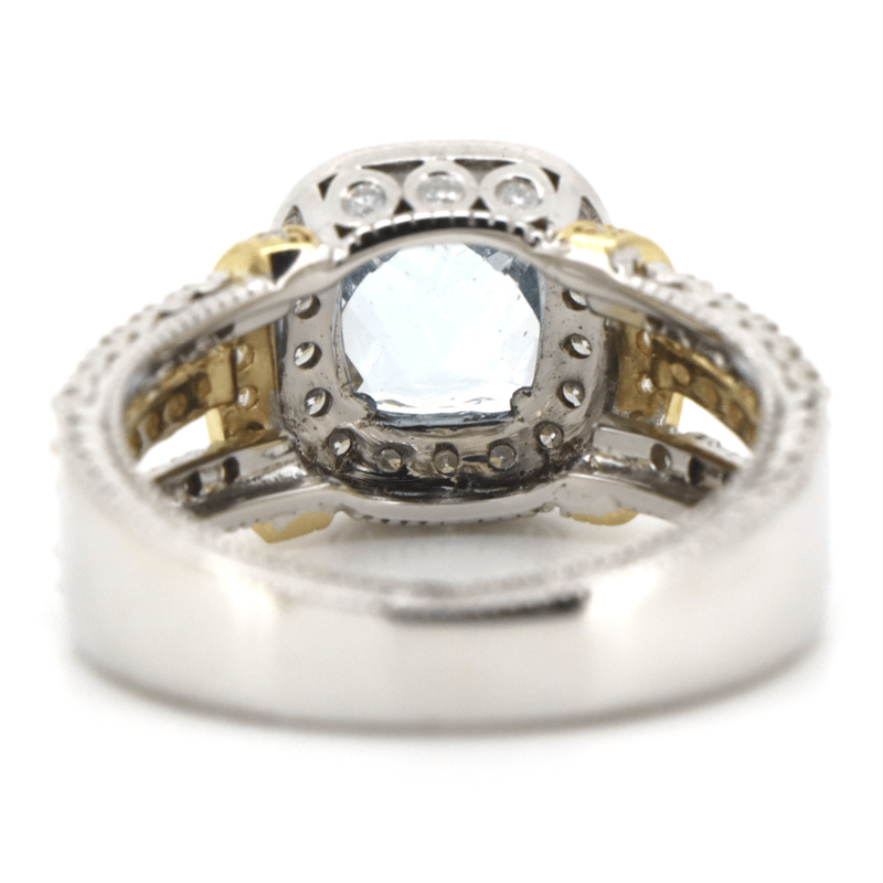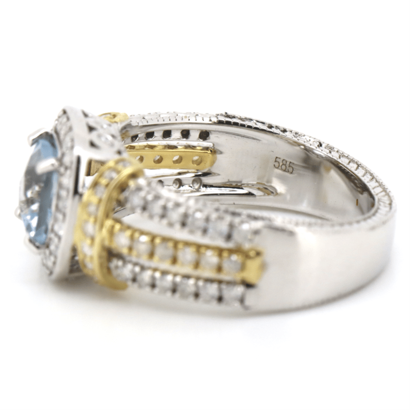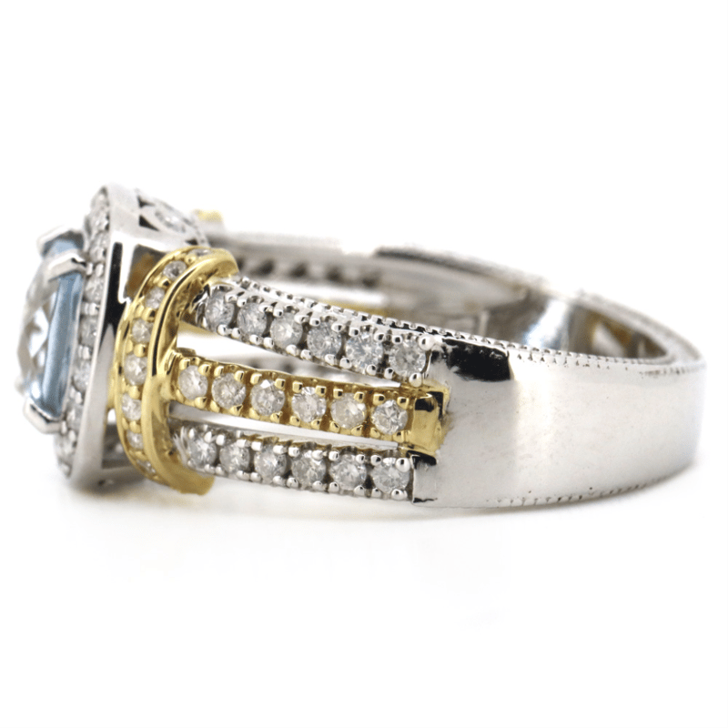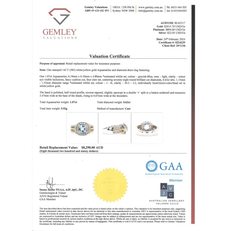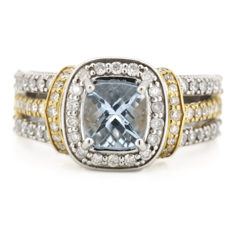 14K WHITE/YELLOW GOLD, AQUAMARINE AND DIAMOND, DRESS RING. The Centre Features, One Fancy Cushion Cut, Light Greyish-Blue, Aquamarine (1.07Ct, Minor Eye Visible Inclusions), Claw Set. Surrounding The Centre In A Halo And Decorating The Shoulders And Triple Split Band Are, 78 Round Brilliant Cut, Diamonds (0.63Ct Tdw, J-K Colour, Si2-I2 Clarity), Bezel/Claw/Bead Set In White/Yellow Gold. Ring Size L 1/2. Valuations Provided by an Independent Third-Party Professional Not Directly Associated With Lloyds Auctions at AUD $$8,290.00This valuation has been conducted by an independent third-party professional. The valuation amount is an assessment by the issuing valuer and does not reflect the auction value of the item. Any inquiries regarding the valuation should be directed to the issuing valuer (refer to contact details on the certificate), as Lloyds Auctions has no affiliation or influence over the valuation, the valuer, or the stated amount. Condition: Good - Refer Images 0+169