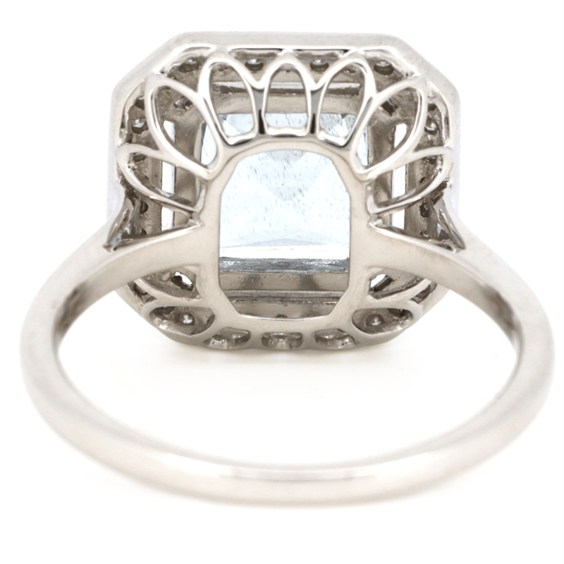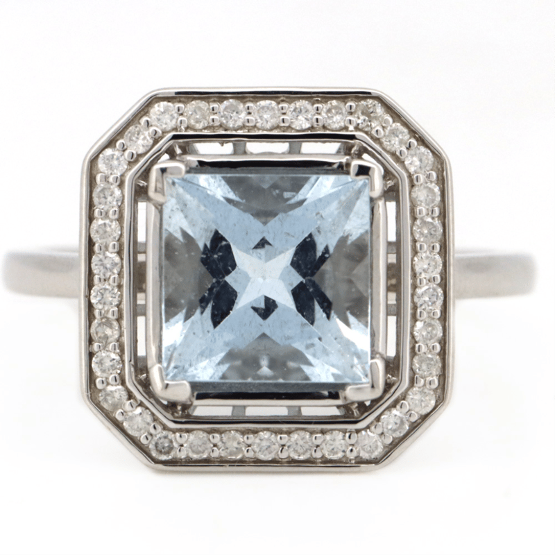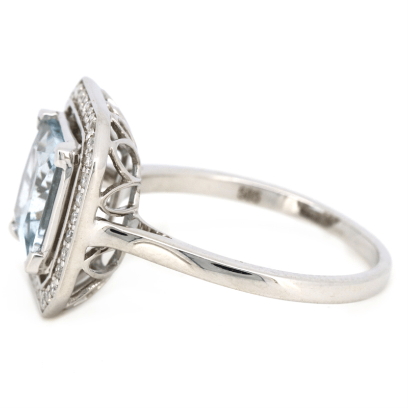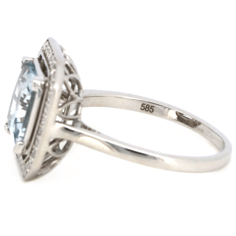 14K WHITE GOLD, AQUAMARINE AND DIAMOND, HALO RING.
