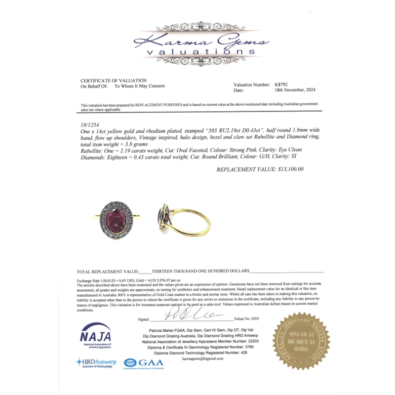 The Centre Features, One Oval Faceted Cut, Strong Pink, Rubellite (2.19Ct, Eye Clean Clarity), Bezel Set. Surrounding The Centre In A Halo Are, 18 Round Brilliant Cut, Diamonds (0.43Ct Tdw, G-H Colour, Si Clarity), Claw Set. Ring Size M.