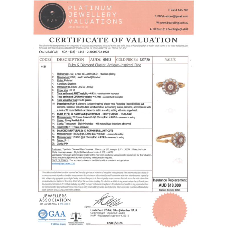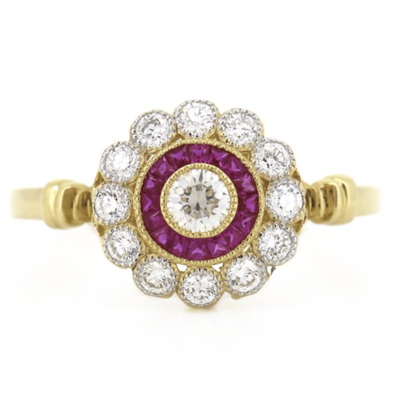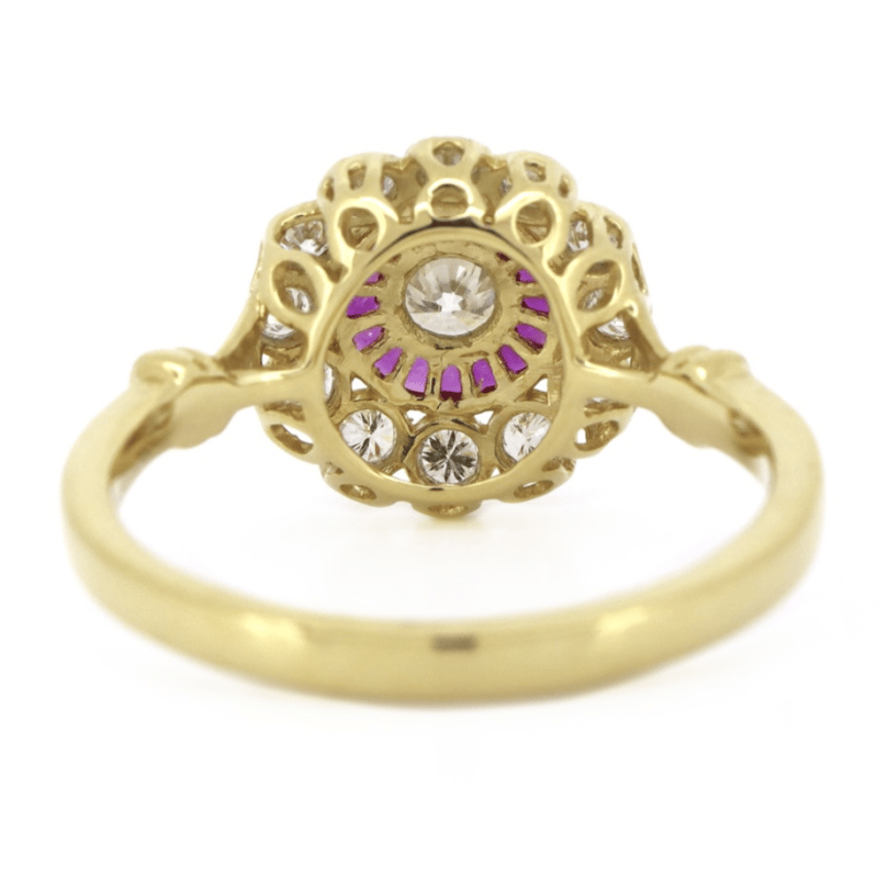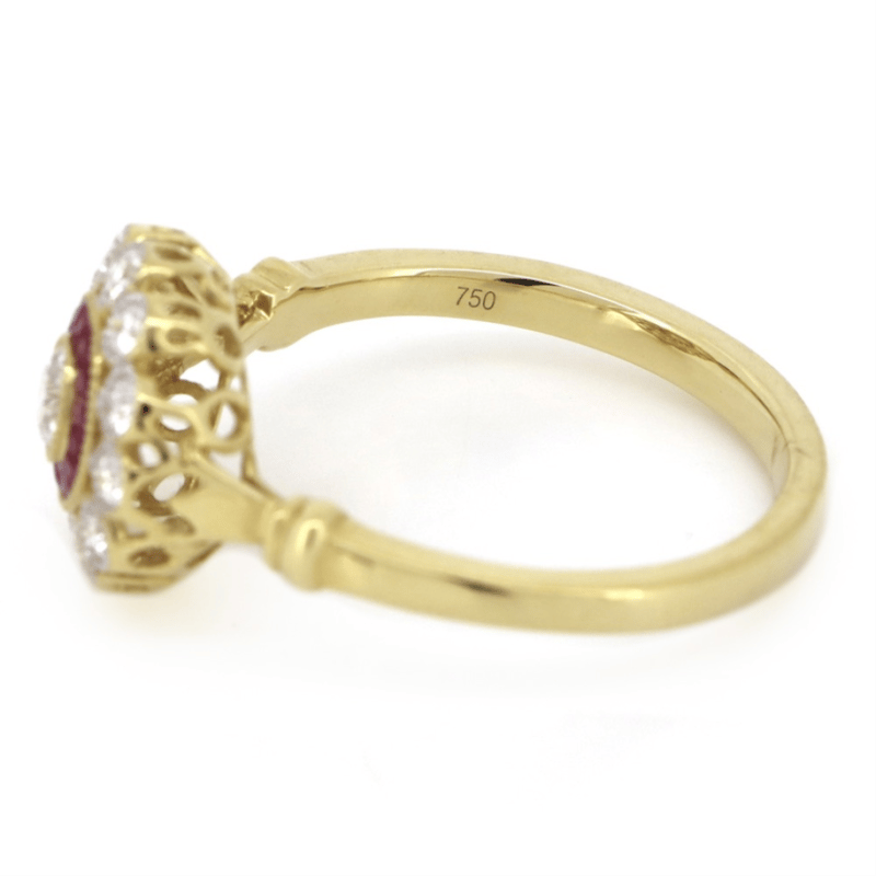 The Centre Features, One Round Brilliant Cut, Diamond (0.46Ct, K-L Colour, P1+ Clarity), Bezel Set. Surrounded By, 20Square French Cut, Strong Reddish Pink, Rubies (0.62Ct Tsw, Slightly Included, Enhanced), Channel Set. Embellishing The Design In A Halo Are, 12 Round Brilliant Cut, Diamonds (0.24Ct Tdw, K-L Colour, P1+ Clarity), Bezel Set With Millegrain Detail. Ring Size T 1/2.