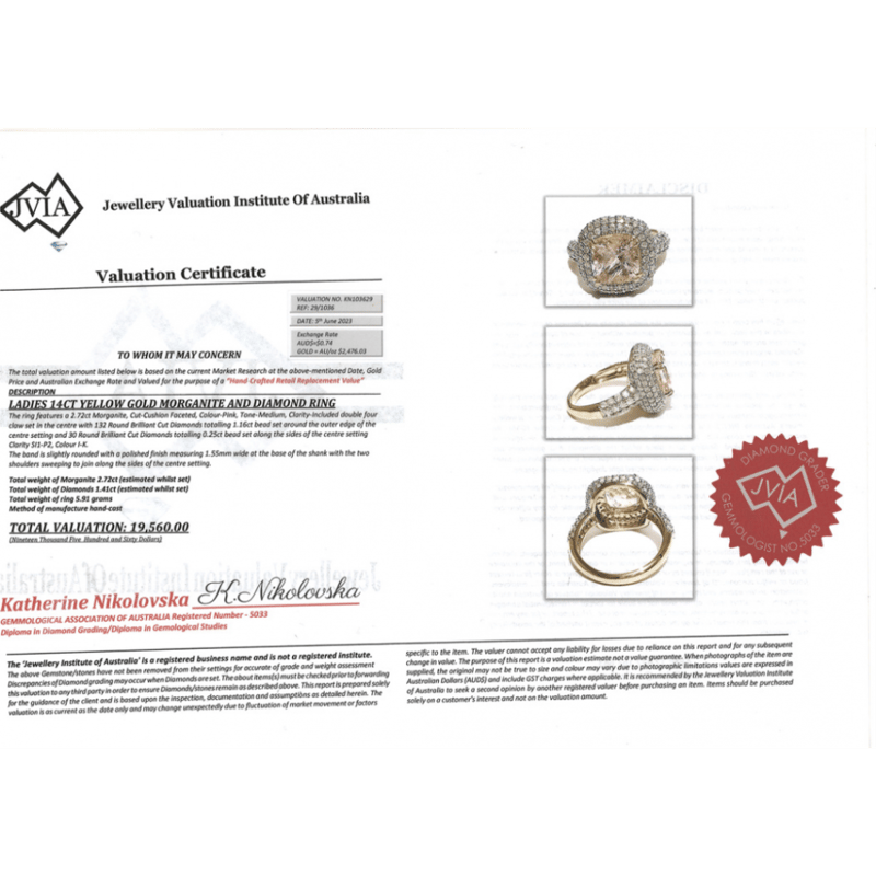 14K YELLOW GOLD, MORGANITE AND DIAMOND, CLUSTER RING. The Centre Features, One Cushion Faceted Cut, Medium Pink, Morganite (2.72Ct, Included), Claw Set. Surrounding The Centre And Decorating The Band In A Cluster Are, 162 Round Brilliant Cut, Diamonds (1.41Ct Tdw, I-K Colour, Si1-P2 Clarity), Bead Set In White Gold. Ring Size M 1/2. Valuations Provided by an Independent Third-Party Professional Not Directly Associated With Lloyds Auctions at AUD $$19,560.00This valuation has been conducted by an independent third-party professional. The valuation amount is an assessment by the issuing valuer and does not reflect the auction value of the item. Any inquiries regarding the valuation should be directed to the issuing valuer (refer to contact details on the certificate), as Lloyds Auctions has no affiliation or influence over the valuation, the valuer, or the stated amount. Condition: Good - Refer Images 0+122