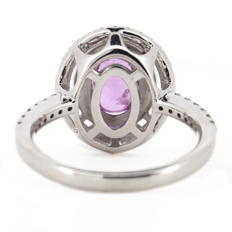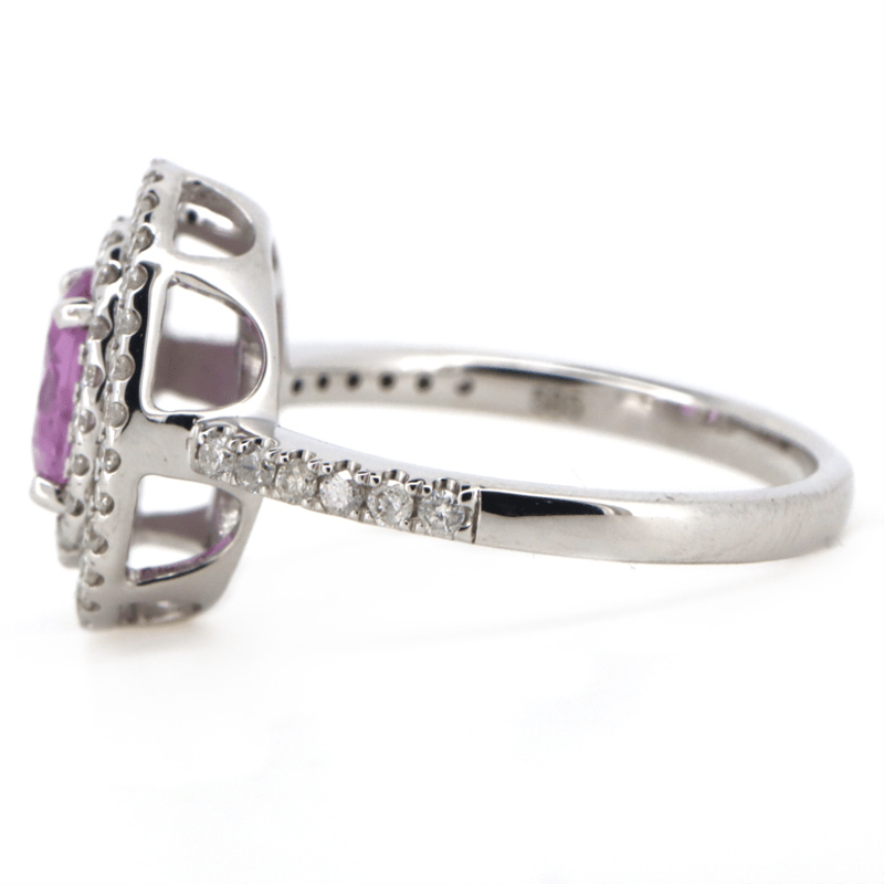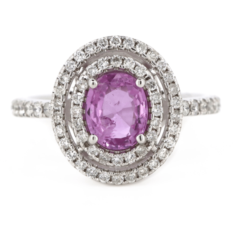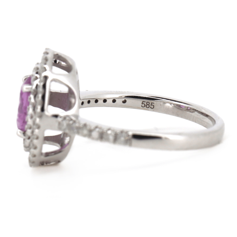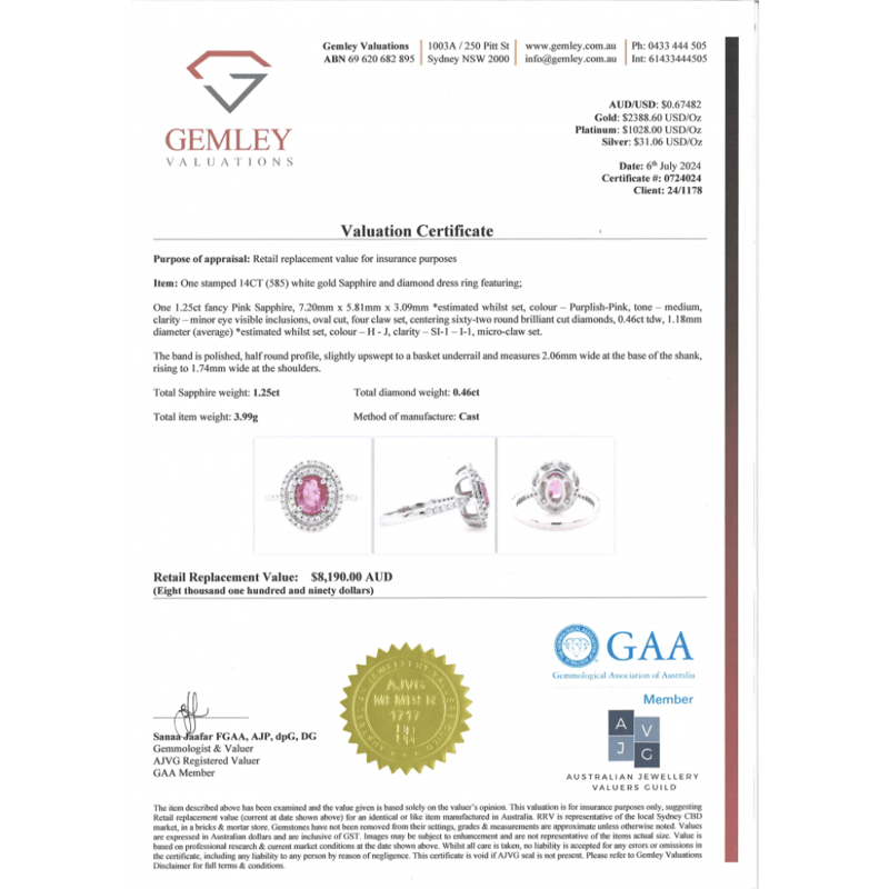 14K WHITE GOLD, PINK SAPPHIRE AND DIAMOND, DOUBLE HALO RING. The Centre Features, One Oval Cut, Fancy Pink, Sapphire (1.25Ct Tsw, Purplish-Pink Colour, Minor Eye Visible Inclusions), 4 Claw Set. Surrounding The Centre In A Double Halo And Decorating The Band Are, 62 Round Brilliant Cut, Diamonds (0.46Ct Tdw, H-J Colour, Si1-I1 Clarity ), Micro-Claw Set. Ring Size M. Valuations Provided by an Independent Third-Party Professional Not Directly Associated With Lloyds Auctions at AUD $$8,190.00This valuation has been conducted by an independent third-party professional. The valuation amount is an assessment by the issuing valuer and does not reflect the auction value of the item. Any inquiries regarding the valuation should be directed to the issuing valuer (refer to contact details on the certificate), as Lloyds Auctions has no affiliation or influence over the valuation, the valuer, or the stated amount. Condition: Good - Refer Images 0+154
