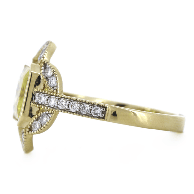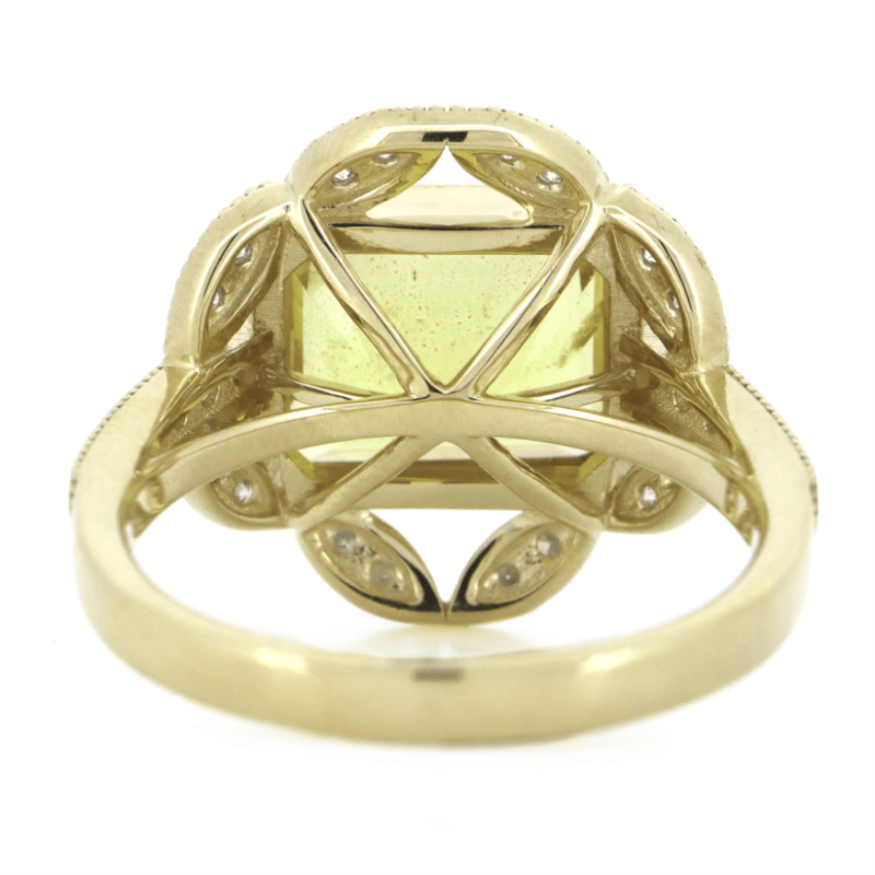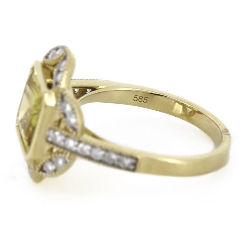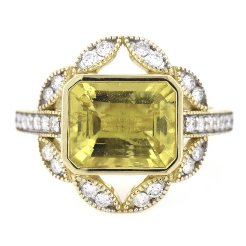 The Centre Features, One Emerald Cut, Golden Yellow, Heliodor (2.83Ct, Lightly Included), Bezel Set. Encompassing The Centre And Decorating The Band Are, 28 Round Brilliant Cut, Diamonds (0.41Ct Tdw, G-J Colour, Si-I2 Clarity), Bead Set. Ring Size O.