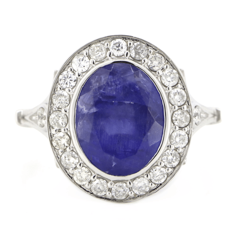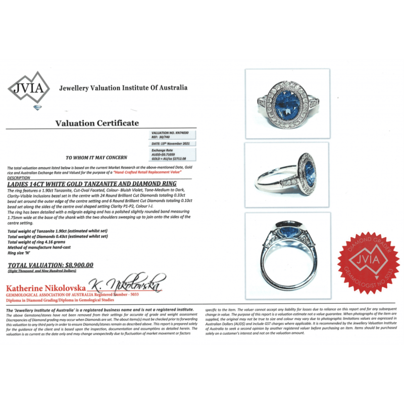 14K WHITE GOLD, TANZANITE AND DIAMOND, HALO RING. The Centre Features, One Oval Faceted Cut, Bluish-Violet, Tanzanite (4.41Ct, Visible Inclusions), Claw Set. Surrounding The Centre In A Halo And Decorating The Shoulders Are, 22 Round Brilliant Cut, Diamonds (0.54Ct Tdw, I-K Colour, Si2-P2 Clarity), Bead Set. Ring Size N. Valuations Provided by an Independent Third-Party Professional Not Directly Associated With Lloyds Auctions at AUD $$9,850.00This valuation has been conducted by an independent third-party professional. The valuation amount is an assessment by the issuing valuer and does not reflect the auction value of the item. Any inquiries regarding the valuation should be directed to the issuing valuer (refer to contact details on the certificate), as Lloyds Auctions has no affiliation or influence over the valuation, the valuer, or the stated amount. Condition: Good - Refer Images 0+199
