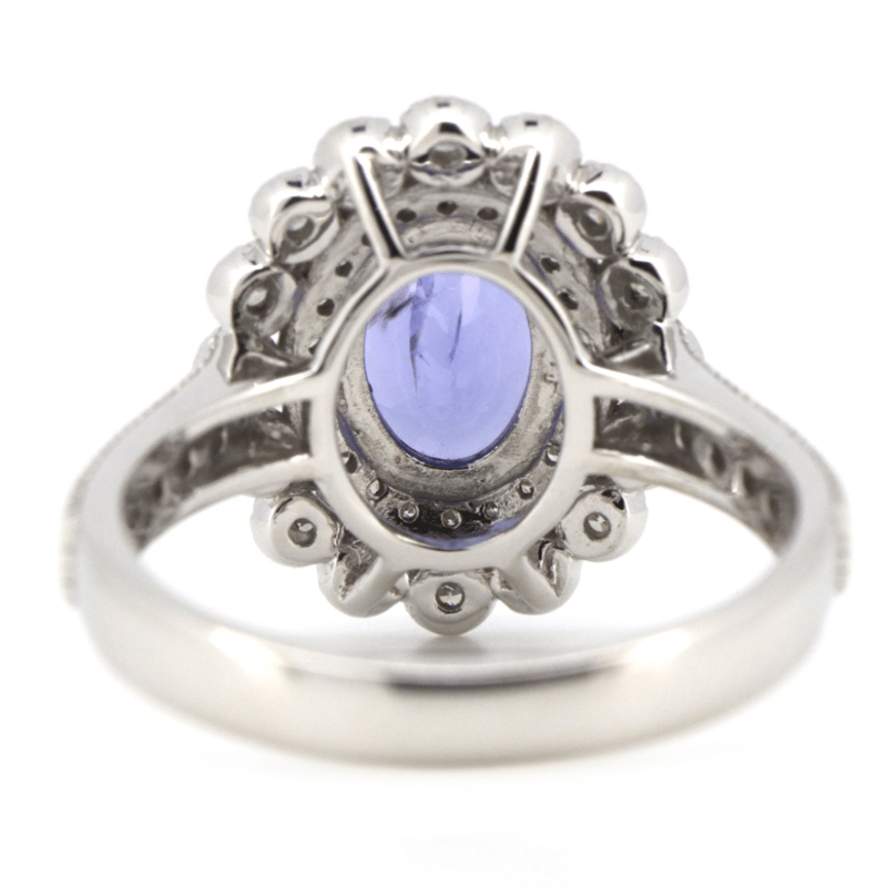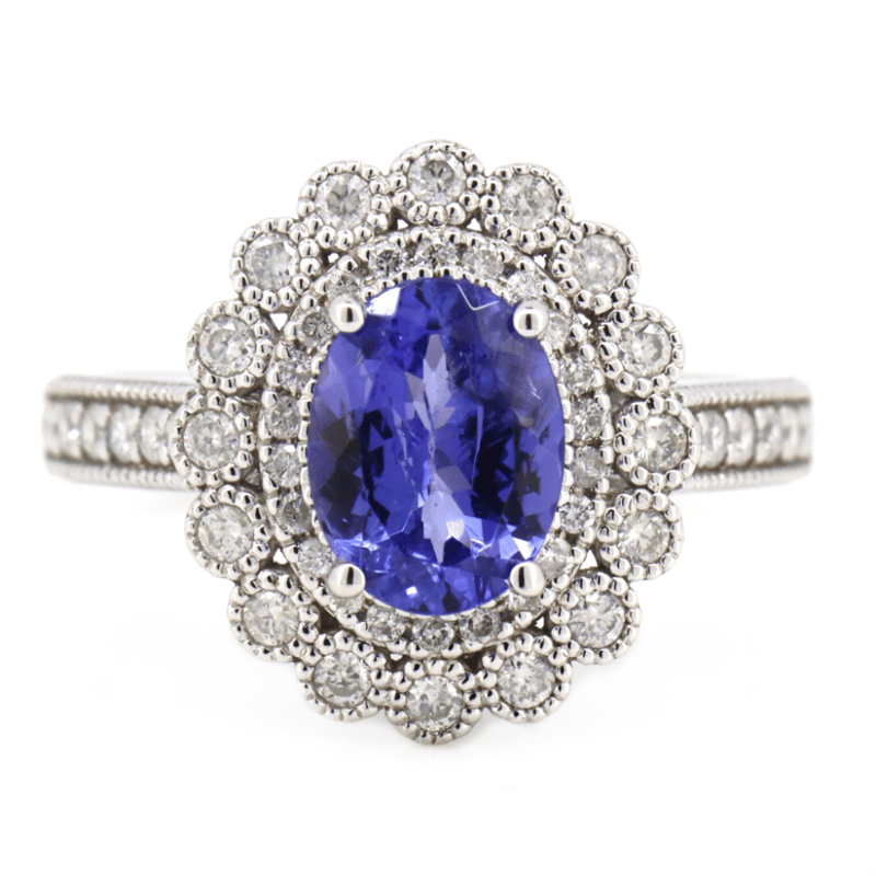 The Centre Features, One Oval Faceted Cut, Moderate Purple, Tanzanite (1.38Ct, Slightly Included), 4 Claw Set. Surrounding The Centre In A Double Halo And Decorating The Band Are, 51 Round Brilliant Cut, Diamonds (0.51Ct Tdw, H-K Colour, P2+ Clarity), Bead/Bezel Set With Millegrain Detail. Ring Size M 1/2.