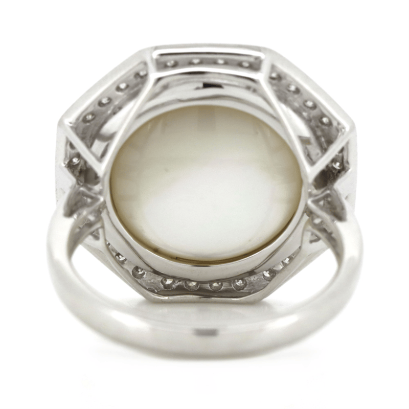 14K WHITE GOLD, WHITE CULTURED SOUTH SEA MABE PEARL AND DIAMOND, DRESS RING. The Centre Features, One Round Cabochon, White With Silver Overtones, Cultured South Sea Mabe Pearl (10.57Ct/14.80Mm Size, Good Lustre), Bezel Set. Decorating The Centre Are, 32 Round Brilliant Cut, Diamonds (0.41Ct Tdw, G-H Colour, Si1-Si2 Clarity), Micro Claw Set. Ring Size M 1/2. Valuations Provided by an Independent Third-Party Professional Not Directly Associated With Lloyds Auctions at AUD $$11,000.00This valuation has been conducted by an independent third-party professional. The valuation amount is an assessment by the issuing valuer and does not reflect the auction value of the item. Any inquiries regarding the valuation should be directed to the issuing valuer (refer to contact details on the certificate), as Lloyds Auctions has no affiliation or influence over the valuation, the valuer, or the stated amount. Condition: Good - Refer Images 0+189