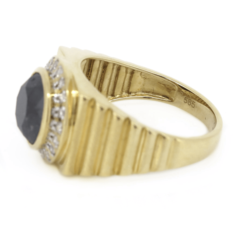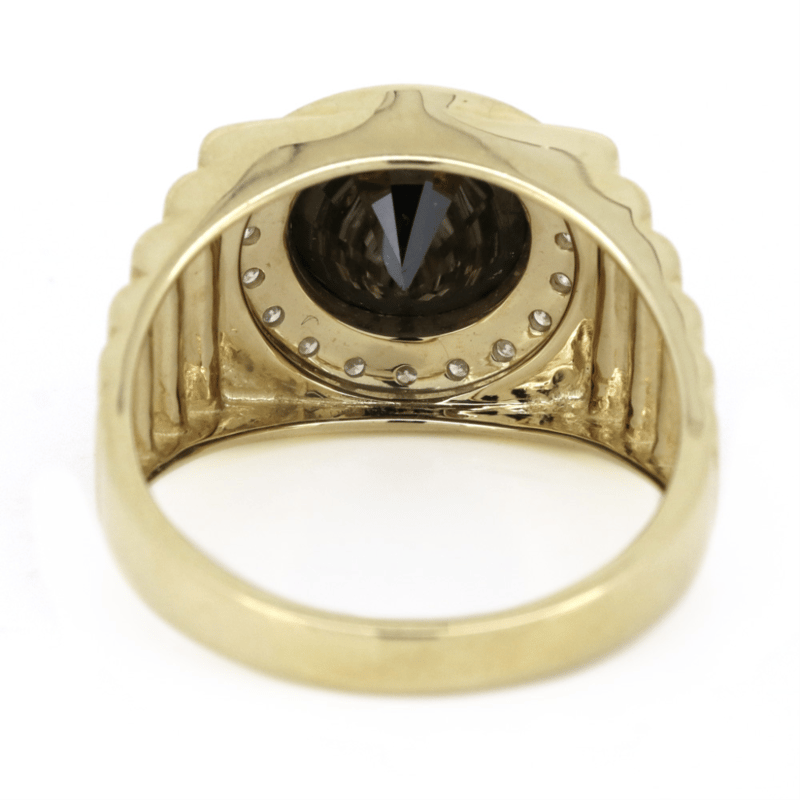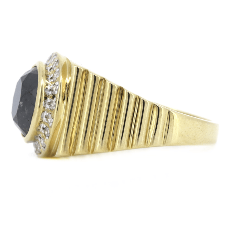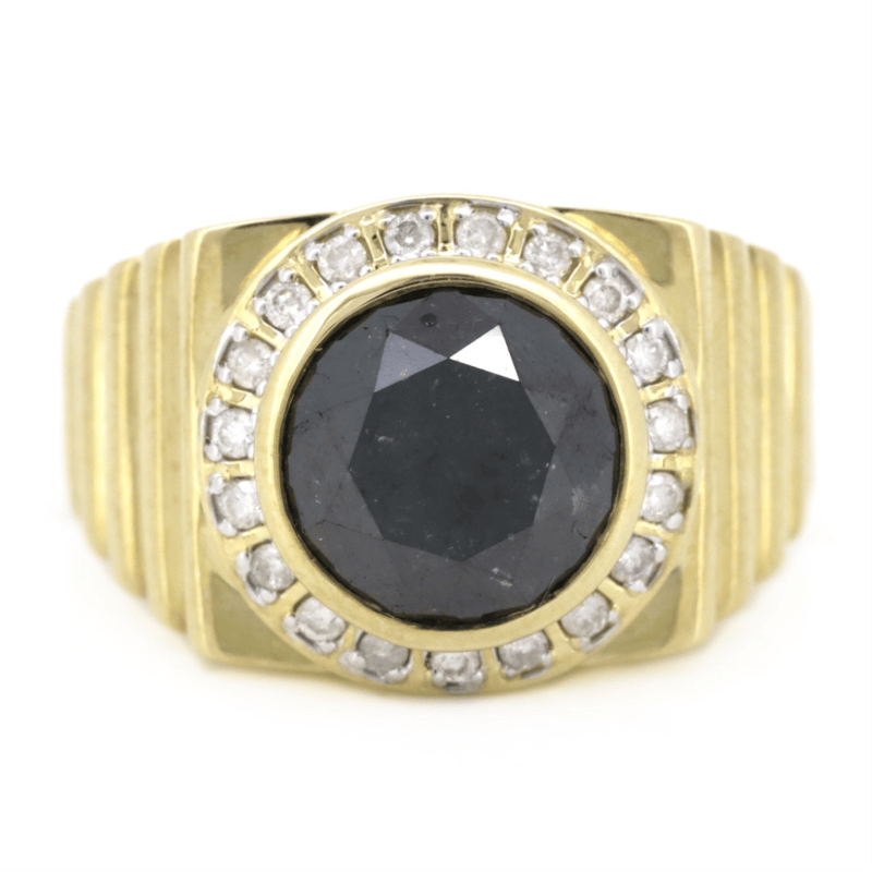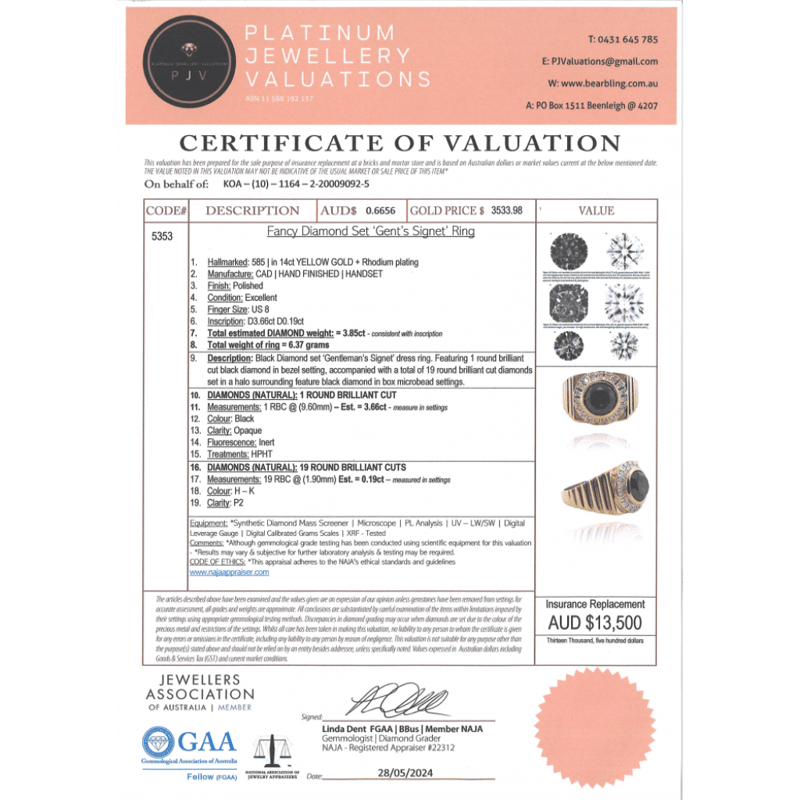 14K YELLOW GOLD, BLACK DIAMOND AND DIAMOND, HALO GENTS RING. The Centre Features, One Round Brilliant Cut, Black, Diamond (3.66Ct, Hpht Enhanced), Bezel Set. Surrounding The Centre In A Halo Are, 19 Round Brilliant Cut, Diamonds (0.19Ct Tdw, H-K Colour, P2 Clarity), Micro-Bead Set. Ring Size P. Valuations Provided by an Independent Third-Party Professional Not Directly Associated With Lloyds Auctions at AUD $$13,500.00This valuation has been conducted by an independent third-party professional. The valuation amount is an assessment by the issuing valuer and does not reflect the auction value of the item. Any inquiries regarding the valuation should be directed to the issuing valuer (refer to contact details on the certificate), as Lloyds Auctions has no affiliation or influence over the valuation, the valuer, or the stated amount. Condition: Good - Refer Images 0+145