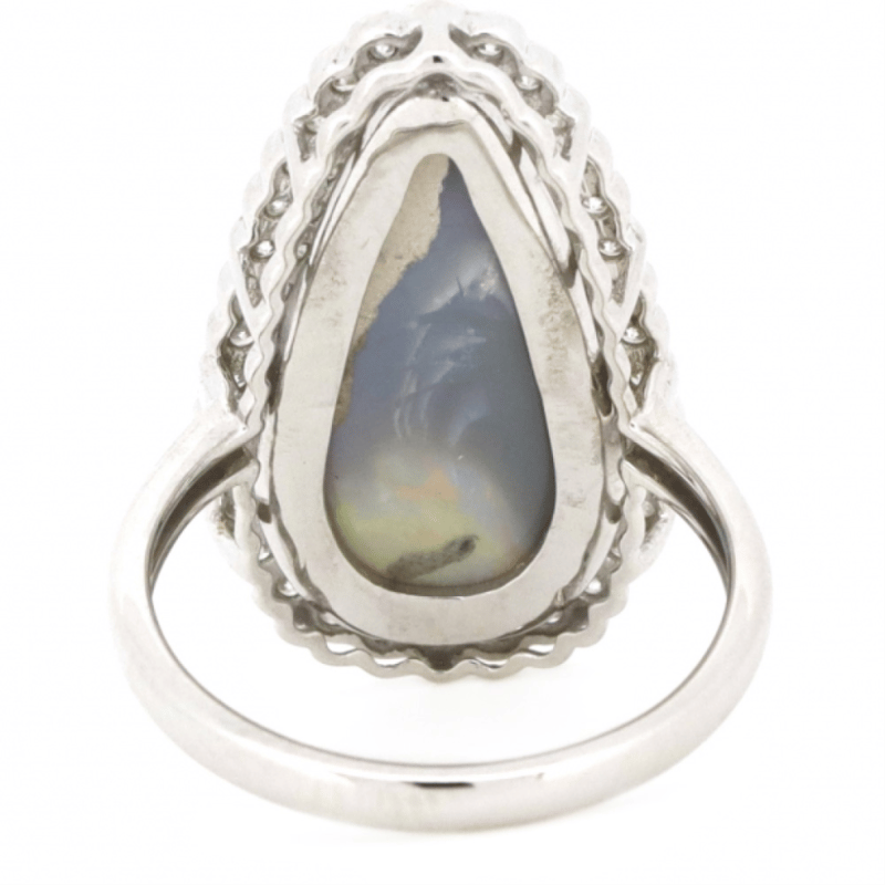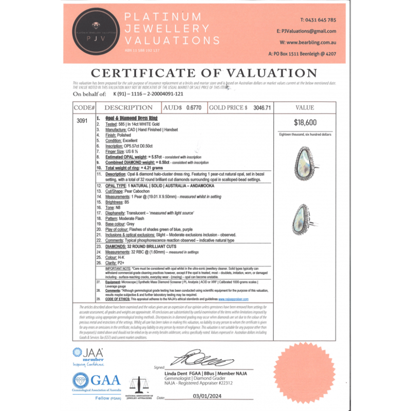 14K WHITE GOLD, 5.57CT AUSTRALIAN ANDAMOOKA OPAL AND DIAMOND, DRESS RING. The Centre Features, One Pear Cabochon Cut, Solid Grey, Australian Andamooka Opal (5.57Ct, Green, Blue And Purple Colour Play, Moderate Flash Pattern), Bezel Set. Surrounding The Centre In A Halo Are, 32 Round Brilliant Cut, Diamonds (0.50Ct Tdw, H-K Colour, P2+ Clarity), Bead Set. Ring Size M. Valuations Provided by an Independent Third-Party Professional Not Directly Associated With Lloyds Auctions at AUD $$18,600.00This valuation has been conducted by an independent third-party professional. The valuation amount is an assessment by the issuing valuer and does not reflect the auction value of the item. Any inquiries regarding the valuation should be directed to the issuing valuer (refer to contact details on the certificate), as Lloyds Auctions has no affiliation or influence over the valuation, the valuer, or the stated amount. Condition: Good - Refer Images 0+106