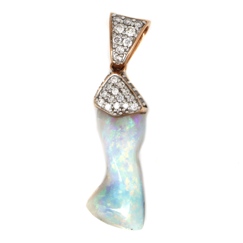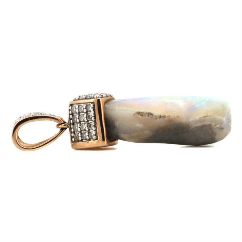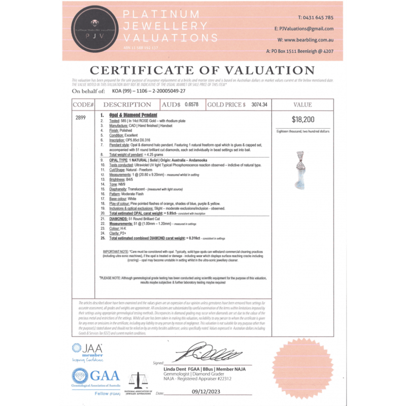 14K ROSE GOLD, 5.85CT AUSTRALIAN ANDAMOOKA OPAL AND DIAMOND, HALO PENDANT. The Centre Design Features, One Natural Freeform, Solid White, Australian Andamooka Opal (5.85Ct, Pine With Flashes Orange, Shades Of Blue, Purple And Yellow, Moderate Exclusion/Inclusion), Capped. Decorating The Bail Are, 51 Round Brilliant Cut, Diamonds (0.316Ct Tdw, H-K Colour, P2+ Clarity), Bead Set. Valuations Provided by an Independent Third-Party Professional Not Directly Associated With Lloyds Auctions at AUD $$18,200.00This valuation has been conducted by an independent third-party professional. The valuation amount is an assessment by the issuing valuer and does not reflect the auction value of the item. Any inquiries regarding the valuation should be directed to the issuing valuer (refer to contact details on the certificate), as Lloyds Auctions has no affiliation or influence over the valuation, the valuer, or the stated amount. Condition: Good - Refer Images 0+197