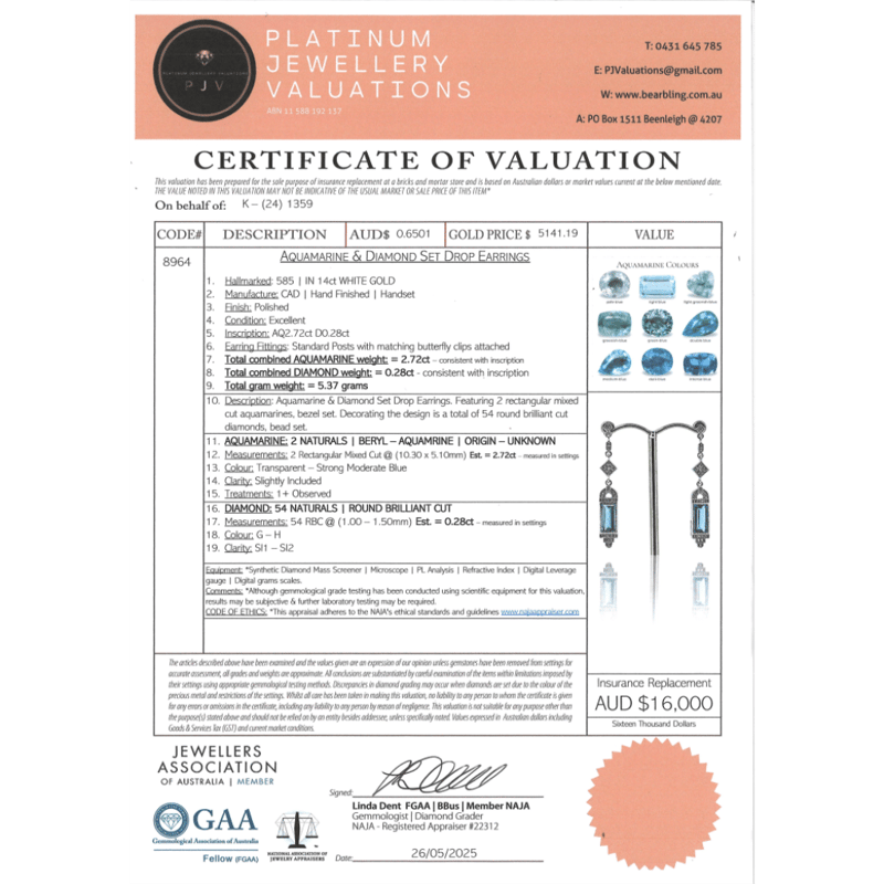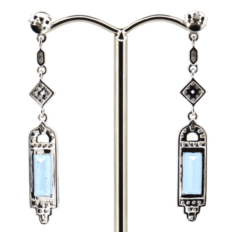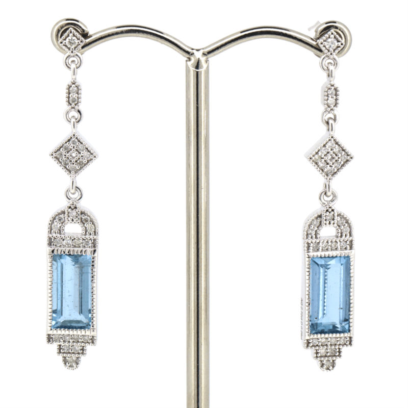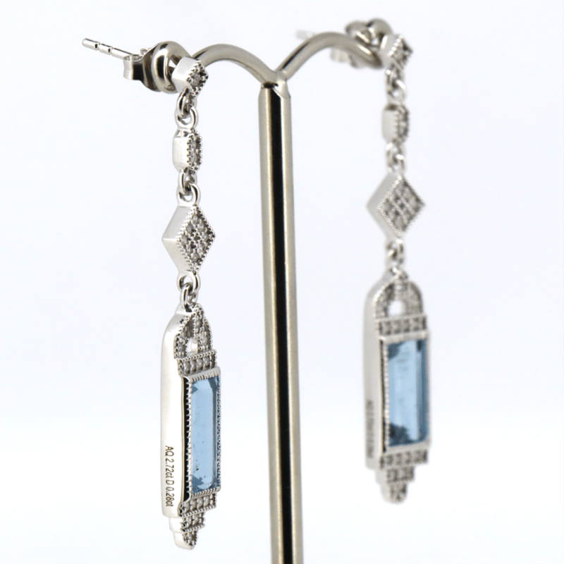14K WHITE GOLD, AQUAMARINE AND DIAMOND, DROP EARRINGS. The Centre Features, 2 Rectangle Cut, Strong Moderate Blue, Aquamarines (2.72Ct Tsw, Slightly Included), Bezel Set. Encompassing The Centre Are, 54 Round Brilliant Cut, Diamonds (0.28Ct Tdw, G-H Colour, Si1-Si2 Clarity), Bead Set. The Earrings Feature Post Back, Butterfly Clasps. Valuations Provided by an Independent Third-Party Professional Not Directly Associated With Lloyds Auctions at AUD $$16,000.00This valuation has been conducted by an independent third-party professional. The valuation amount is an assessment by the issuing valuer and does not reflect the auction value of the item. Any inquiries regarding the valuation should be directed to the issuing valuer (refer to contact details on the certificate), as Lloyds Auctions has no affiliation or influence over the valuation, the valuer, or the stated amount. Condition: Good - Refer Images 0+162