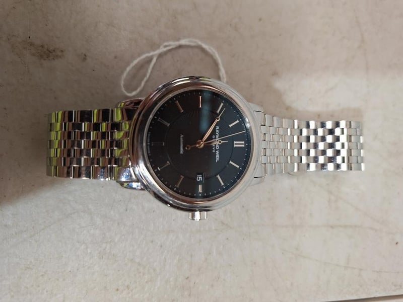 1x RAYMOND WEIL automatic watch black dial with silver tone hour markers and date display, silver tone bracelet with fold-over deployment clasp, 5x assorted watches