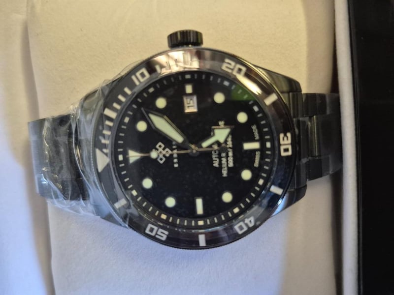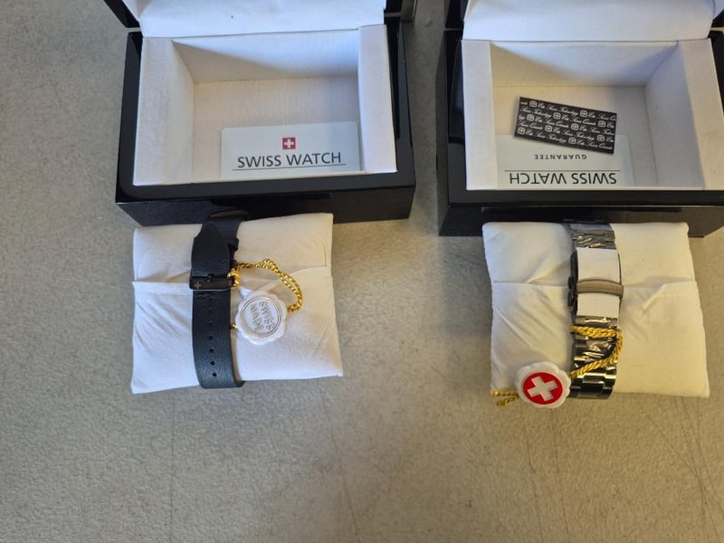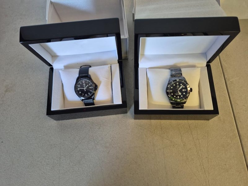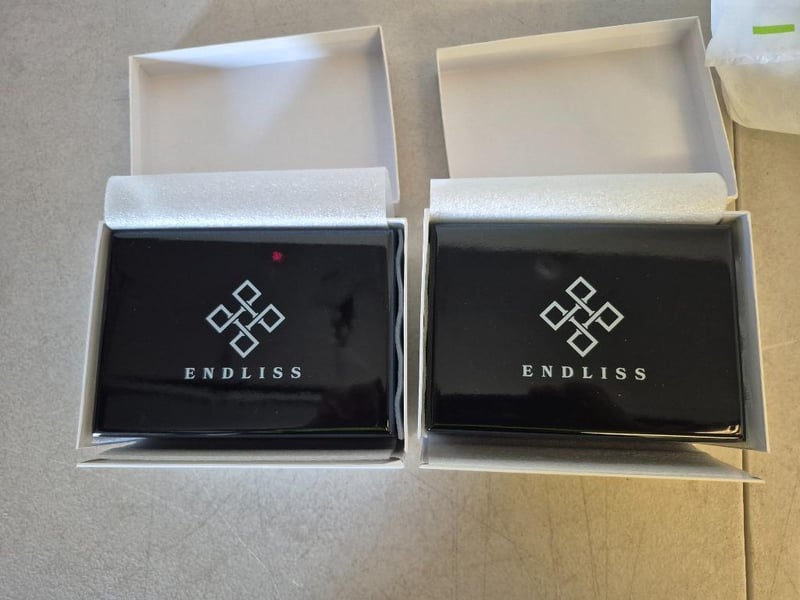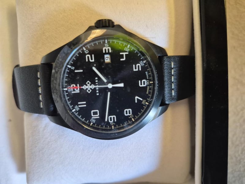 2 x ENDLESS CO WATCHES, 1 x Automatic Watch, black dial with date display, green & silver tone hourmarkers, black bracelet with foldover deployment clasp, Swiss made, NEW with tags, in case, 1 x Automatic watch, black dial with date display, white hourmarkers, black leather strap, black buckle, Swiss made, NEW with tags, in case