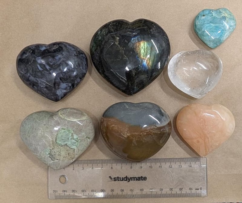 SEVEN CARVED STONE HEART CRYSTALS FROM MADAGASCAR