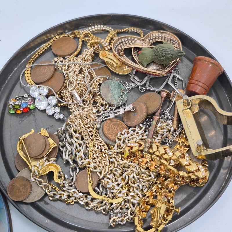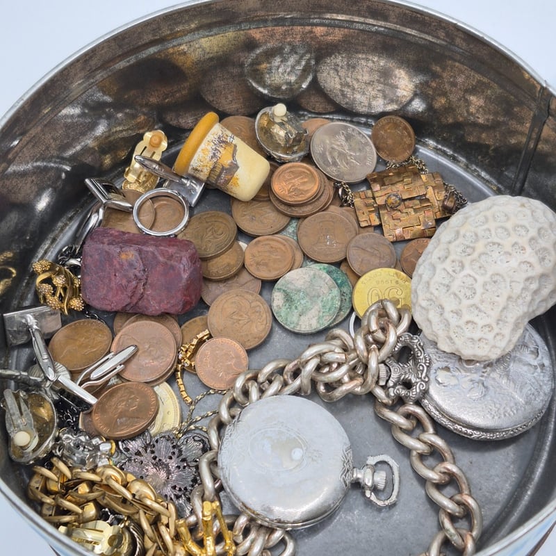 TIN OF ASSORTED JEWELLERY, COINS AND MORECondition: Good - Refer To Images586182+15