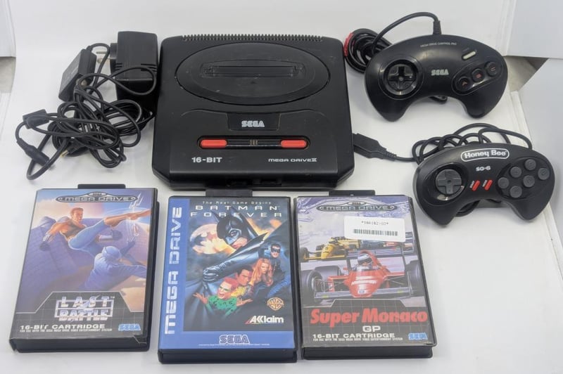 SEGA MEGA DRIVE II 16-BIT CONSOLE WITH CONTROLLERS, GAMES AND ACCESSORIESItem Size: Height: 11cm, Width: 25cm, Depth: 18cm, Weight: 1.8KgComplete Sega Mega Drive Ii 16-Bit Gaming Console System Featuring The Original Black Unit With Cartridge Slot, Dual Red Power/Reset Buttons, And Dual Controller Ports. Includes Two Wired Controllers—One Official Sega Pad With Three Action Buttons And Directional Pad, One Honey Bee Sc-6 Pad With Six-Button Layout. Accompanied By Original Power Adapter, Rf Unit With Antenna Connection, And Power Cable. Console Exhibits Normal Cosmetic Wear Consistent With Age Including Minor Scratches And Dust MarksThree Games Include:Last Battle (Action), Super Monaco Gp (Racing), And Batman Forever (Action/Adventure). All Games Retain Original Black Clamshell Cases With Printed Artwork And Spine LabelsCondition: Good - Refer To Images586182+26