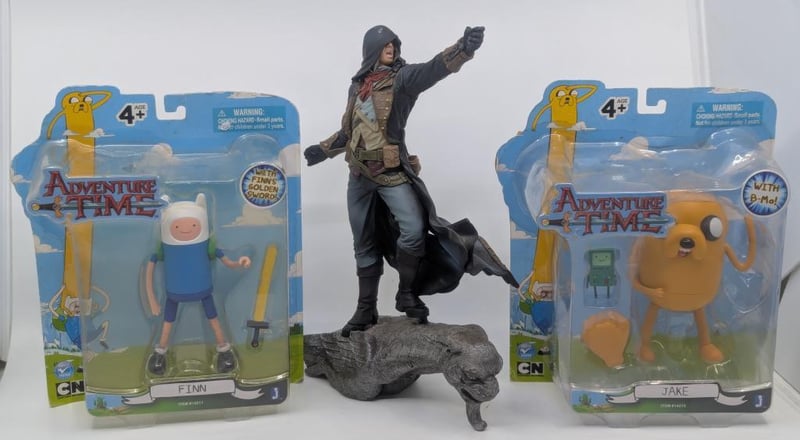 ASSASSIN'S CREED UNITY STATUE AND TWO ADVENTURE TIME COLLECTOR FIGURESIncludes:ASSASSIN'S CREED UNITY - ARNO DORIAN COLLECTIBLE STATUEItem Size: Height: 28cm, Width: 12cm, Depth: 15cm, Weight: 0.8KgHigh-Quality Collectible Figurine Depicting Arno Victor Dorian From Assassin's Creed Unity.ADVENTURE TIME FINN ACTION FIGURE WITH GOLDEN SWORD - BANTER TOYS COLLECTIBLEItem Size: Height: 15cm, Width: 20cm, Depth: 8cm, Weight: 0.15KgSealed Adventure Time Action Figure Featuring Finn From Adventure TimeADVENTURE TIME JAKE THE DOG ACTION FIGURE WITH B-MO ACCESSORYItem Size: Height: 15cm, Width: 12cm, Depth: 8cm, Weight: 0.15KgOfficially Licensed Adventure Time Collectible Featuring Jake The Dog And B-MoCondition: Good - Refer To Images586182+16