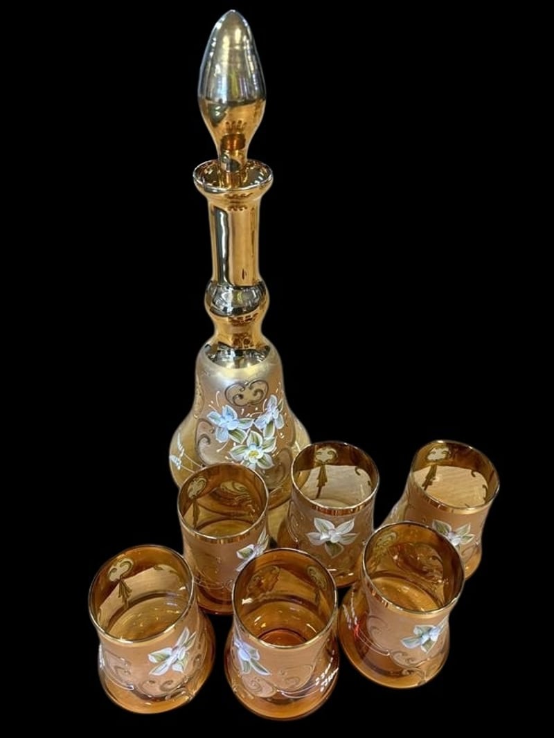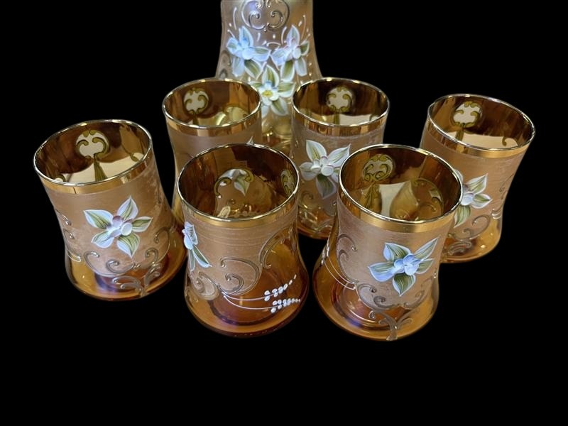 VINTAGE STYLE MURANO GLASS DECANTER & TUMBLER SET – GOLD STYLE OVERLAY WITH ENAMEL FLORALS (7-PIECE SET)