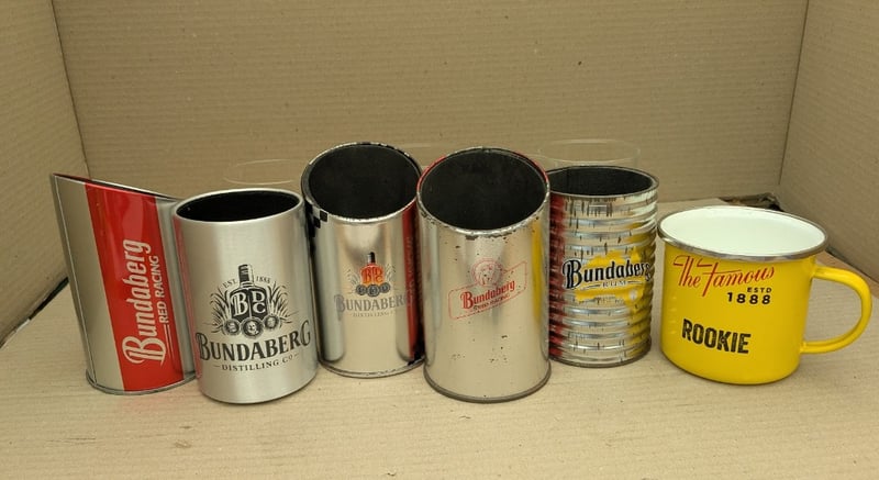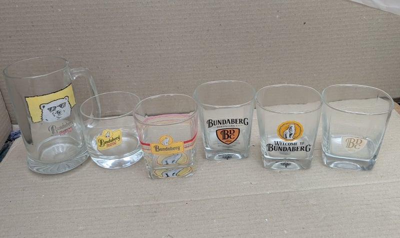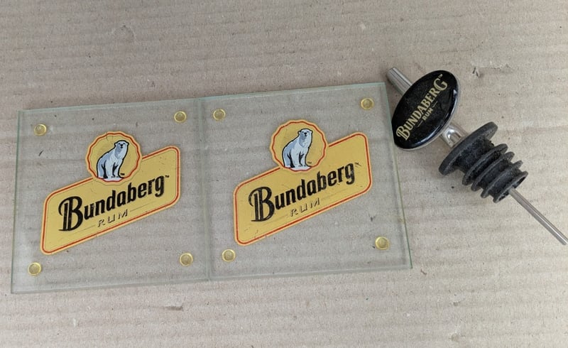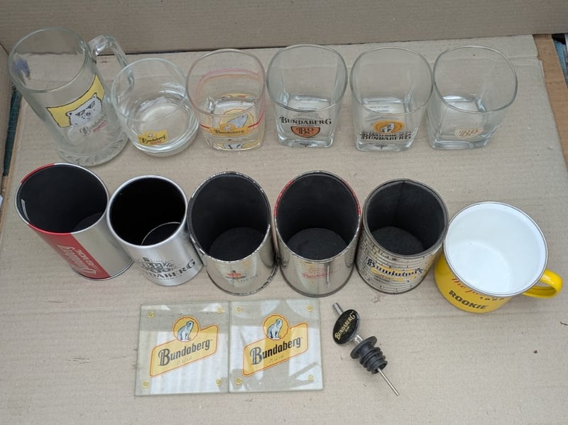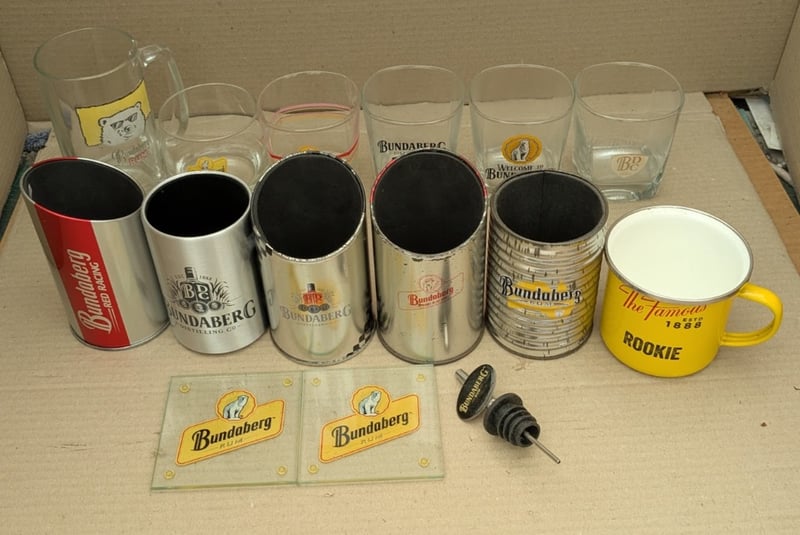 COLLECTABLE MANCAVE BUNDABERG RUM BARWARES INCLUDE WHISKY GLASSES, BEER AND COFFEE MUG, COOLERS, COASTERS & DRINK DISPENSERCondition: Good - Refer To Images10B586252+7